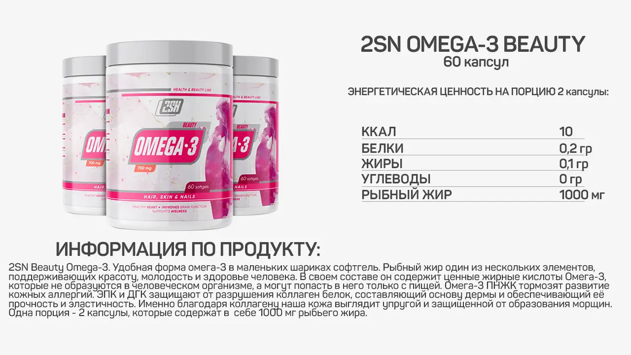2SN Beauty Omega-3 – это полиненасыщенные жирные кислоты, которые являются незаменимыми для нашего организма и поступают только с пищей. В организме преимущественно выполняют структурные функции, входят в состав клеточных мембран клеток каждого органа и тканей. Обеспечивают баланс «хорошего» (Липо Протеиды Высокой Плотности) и «плохого» (Липо Протеиды Низкой Плотности) холестерина.
