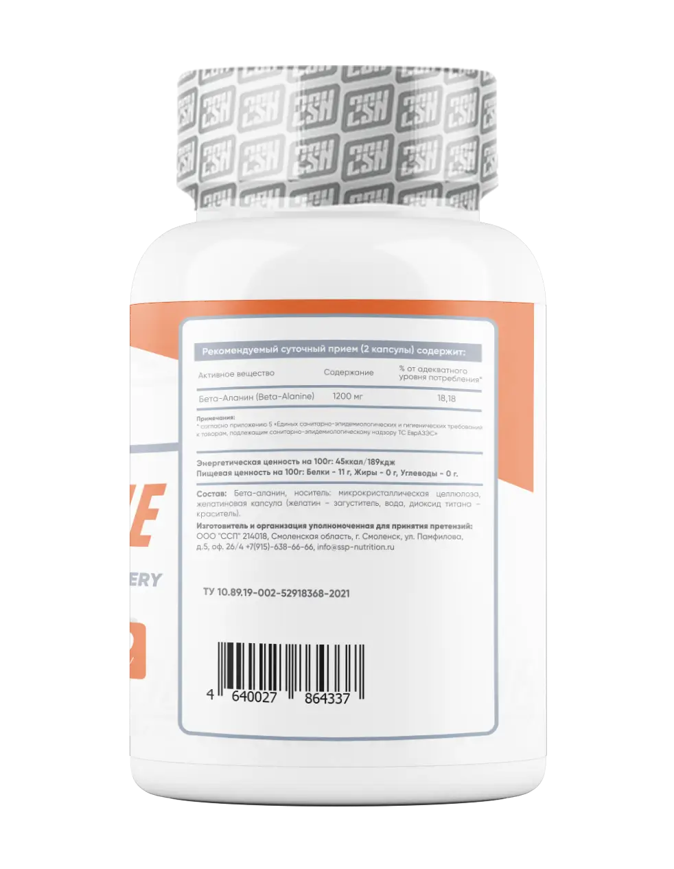 Состав: Бета-аланин, носитель, микрокристаллическая целлюлоза, желатиновая капсула (желатин - загуститель, вода, диоксид титана - краситель).