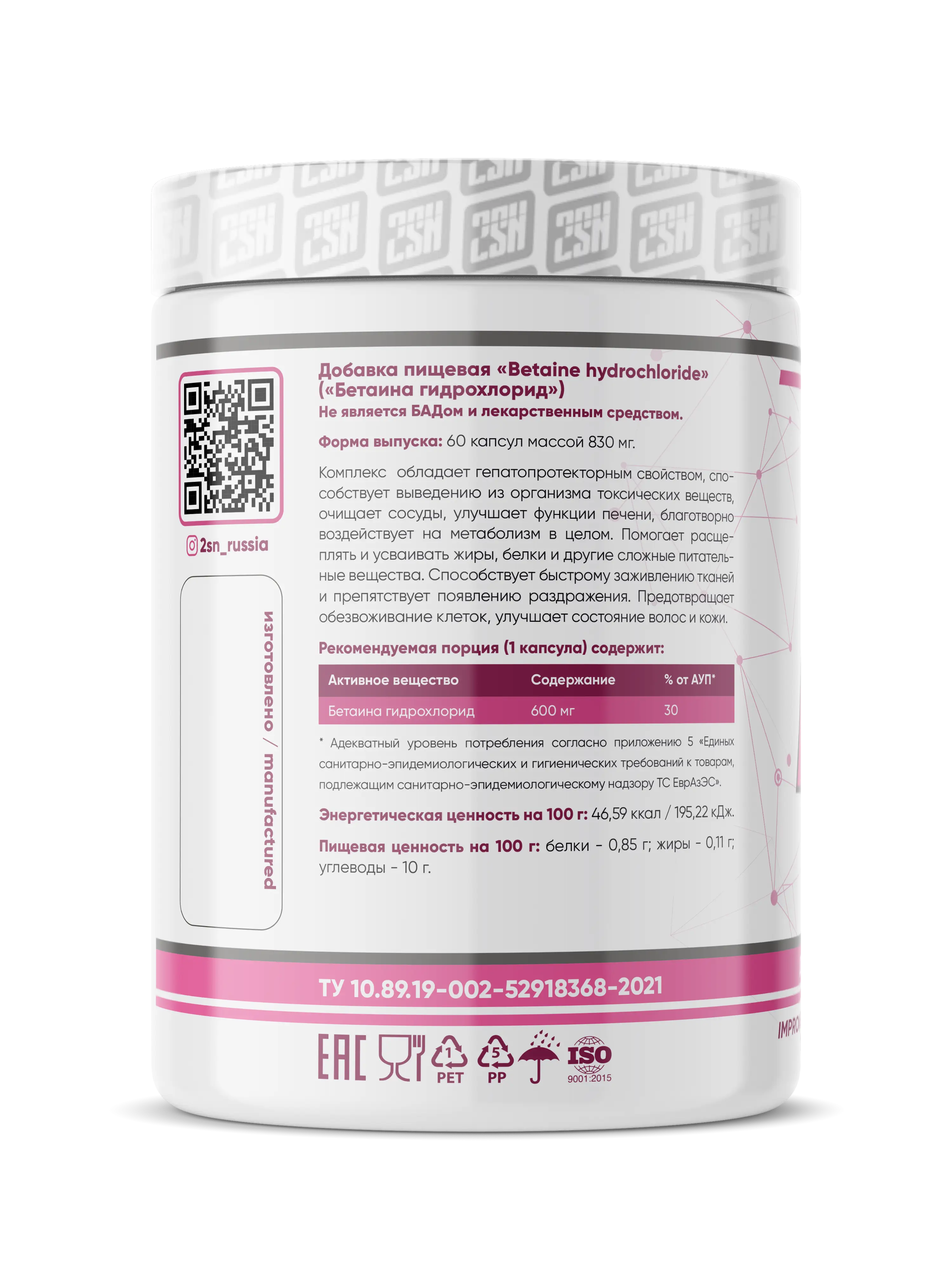 2SN Betaine Hydrochloride 600mg 60 caps