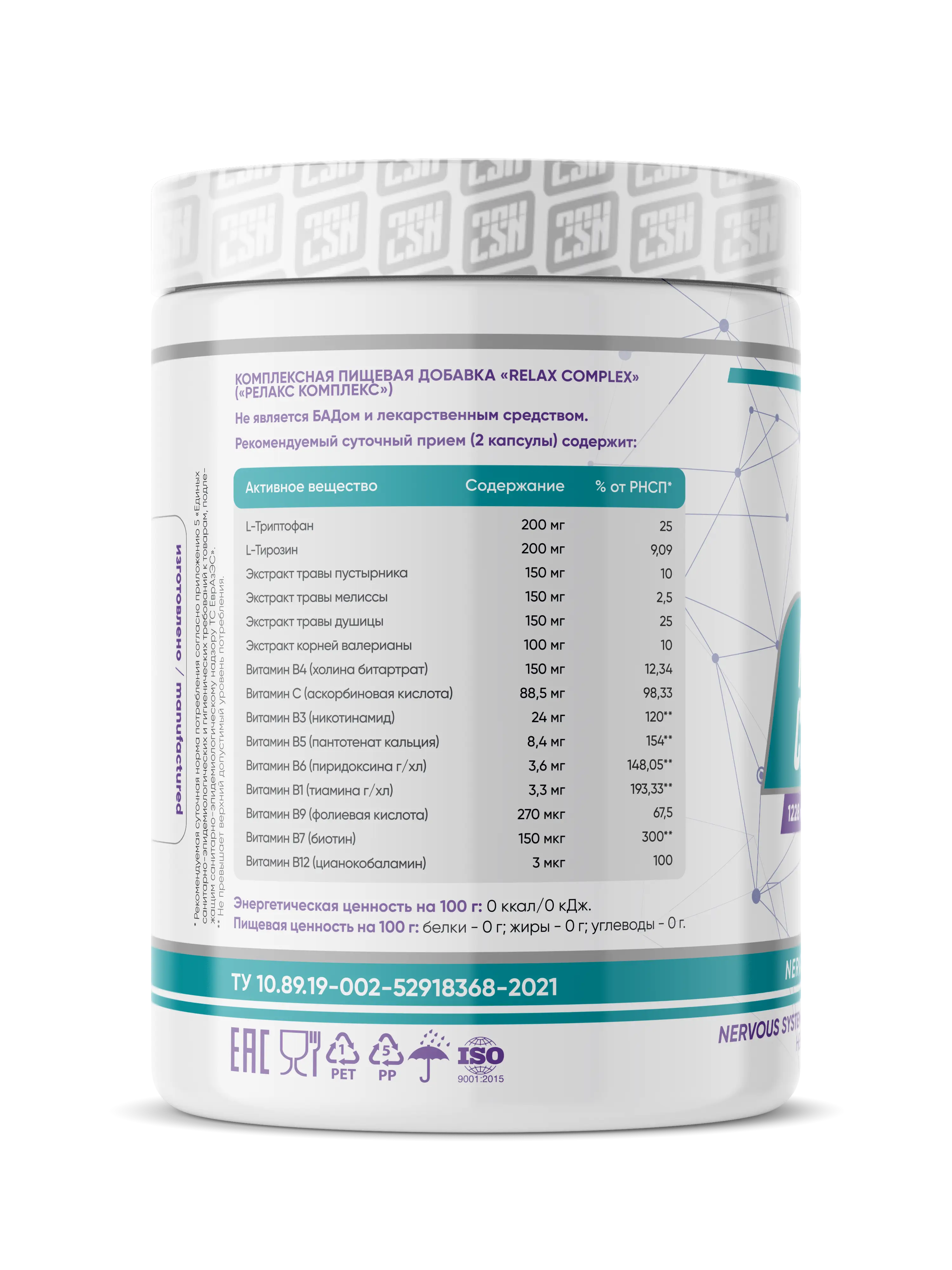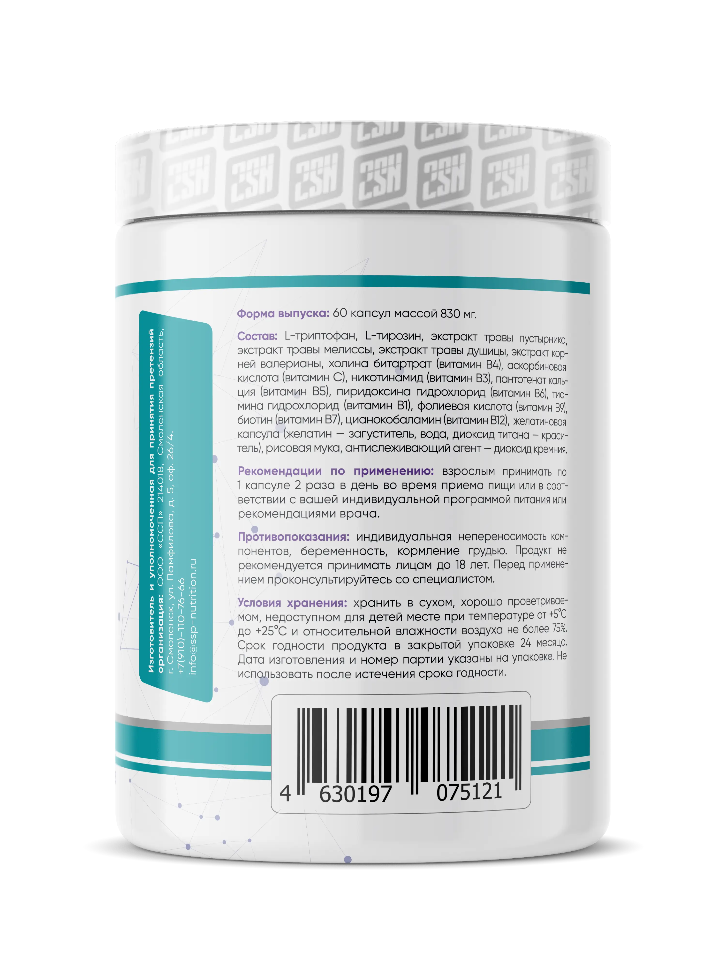 Состав: |-триптофан, |-тирозин, экстракт травы пустырника, экстракт травы мелиссы, экстракт травы душицы, экстракт корней валерианы, холина битартрат (витамин ВА), аскорбиновая кислота (витамин С), никотинамид (витамин ВЗ), пантотенат кальция (витамин В5), пиридоксина гидрохлорид (витамин В), тиамина гидрохлорид (витамин В), фолиевая кислота, биотин (витамин В7), цианокобаламин (витамин В12), желатиновая капсула (желатин — загуститель, вода, диоксид титана — краситель), рисовая мука, антислеживающий агент — диоксид кремния.