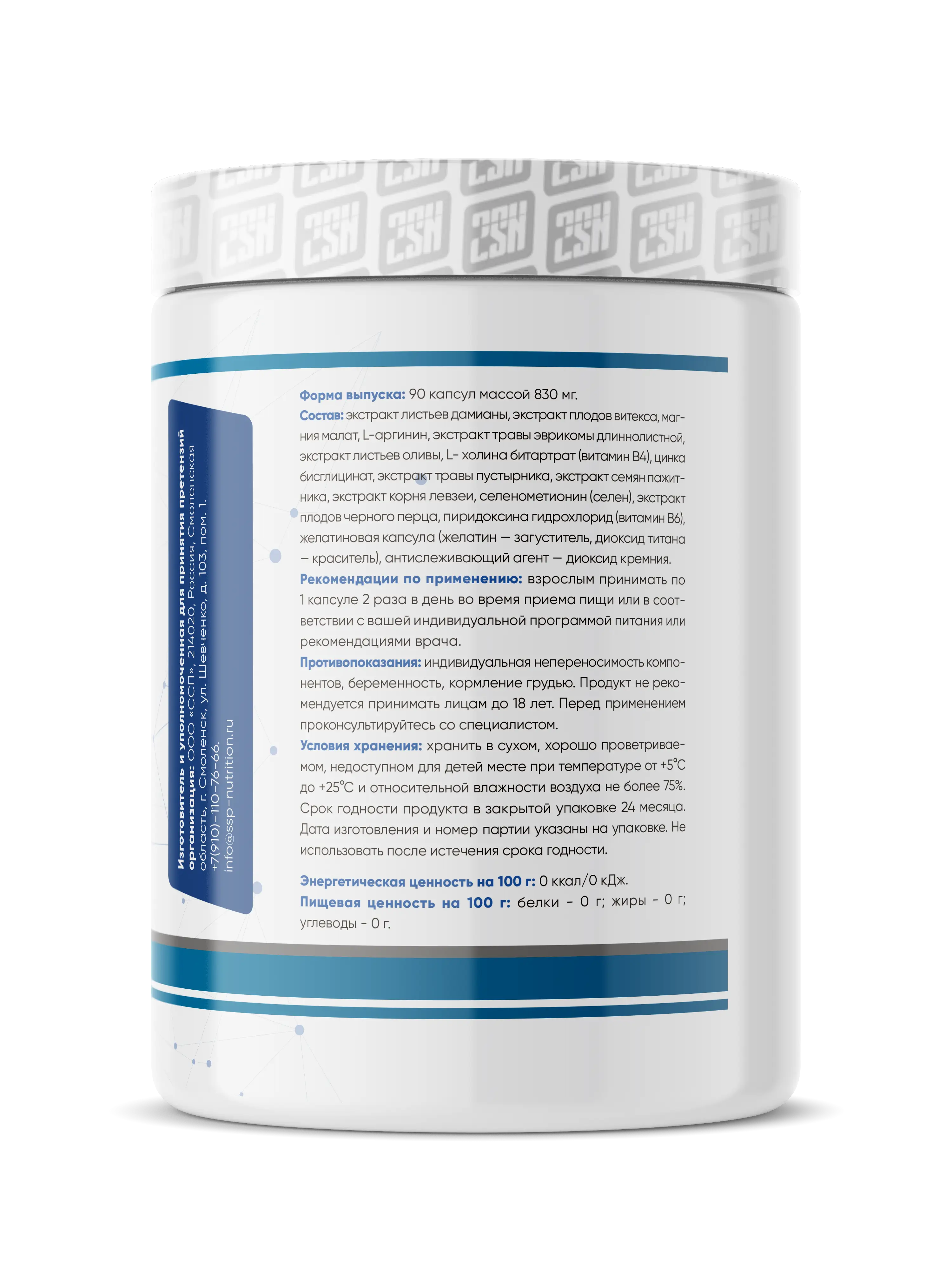 Состав: экстракт листьев дамианы, экстракт плодов витексо, г,юг-ния молот, [-оргинин, экстракт травы эврикомы длиннолистной,экстрокт листьев оливы, Е- холина битортрот (витамин В4), цинкабисглицинот, экстракт травы пустырника, экстрокт семян пажит-ника,экстрокт корня левзеи, селенометионин (селен), экстрактплодов черного перца, пиридоксина гидрохлорид (витамин 86),желатиновая капсула (желатин — загуститель, диоксид титана— краситель), онтислеживоющий агент — диоксид кремния.