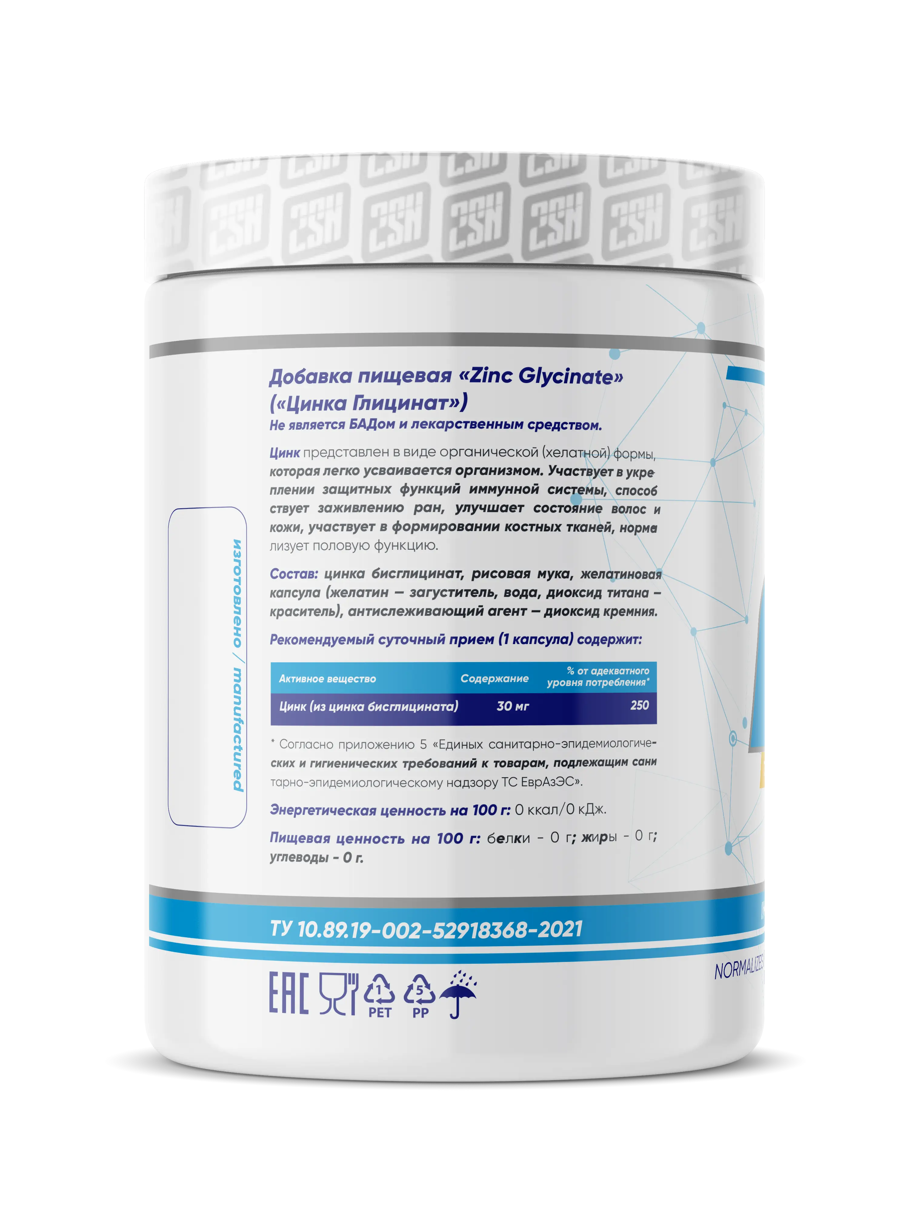 Состав - цинка бисглицинат, рисовая мука, желатиновая капсула(желатин - загуститель, вода. диоксид титана - краситель), агтислеживающий агент - диоксид кремния.