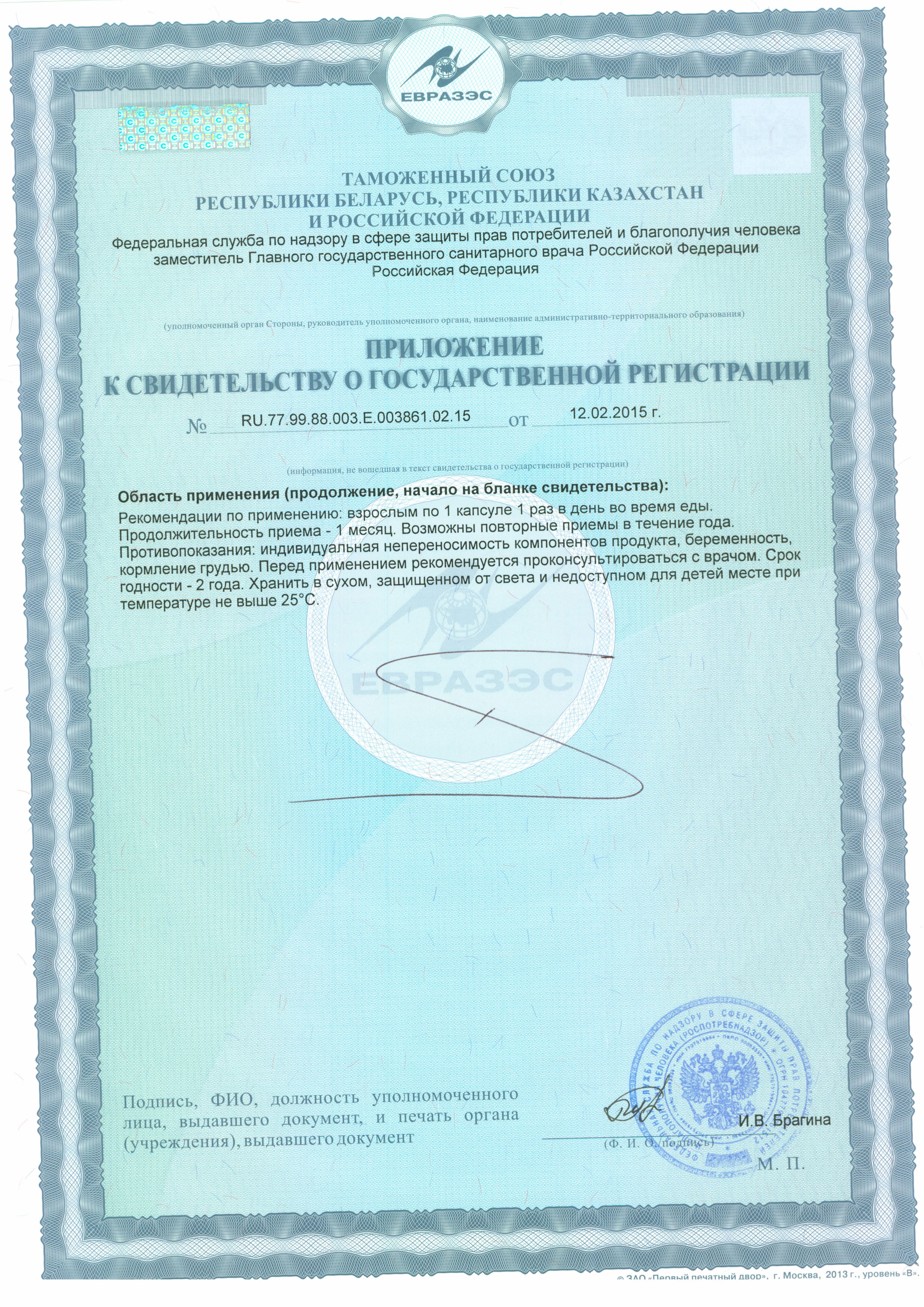 Рекомендации к применению: взрослым по 1 капсуле 1 раз в день во время еды. Продолжительность приема - 1 месяц. Возможны повторные приемы в течение года.