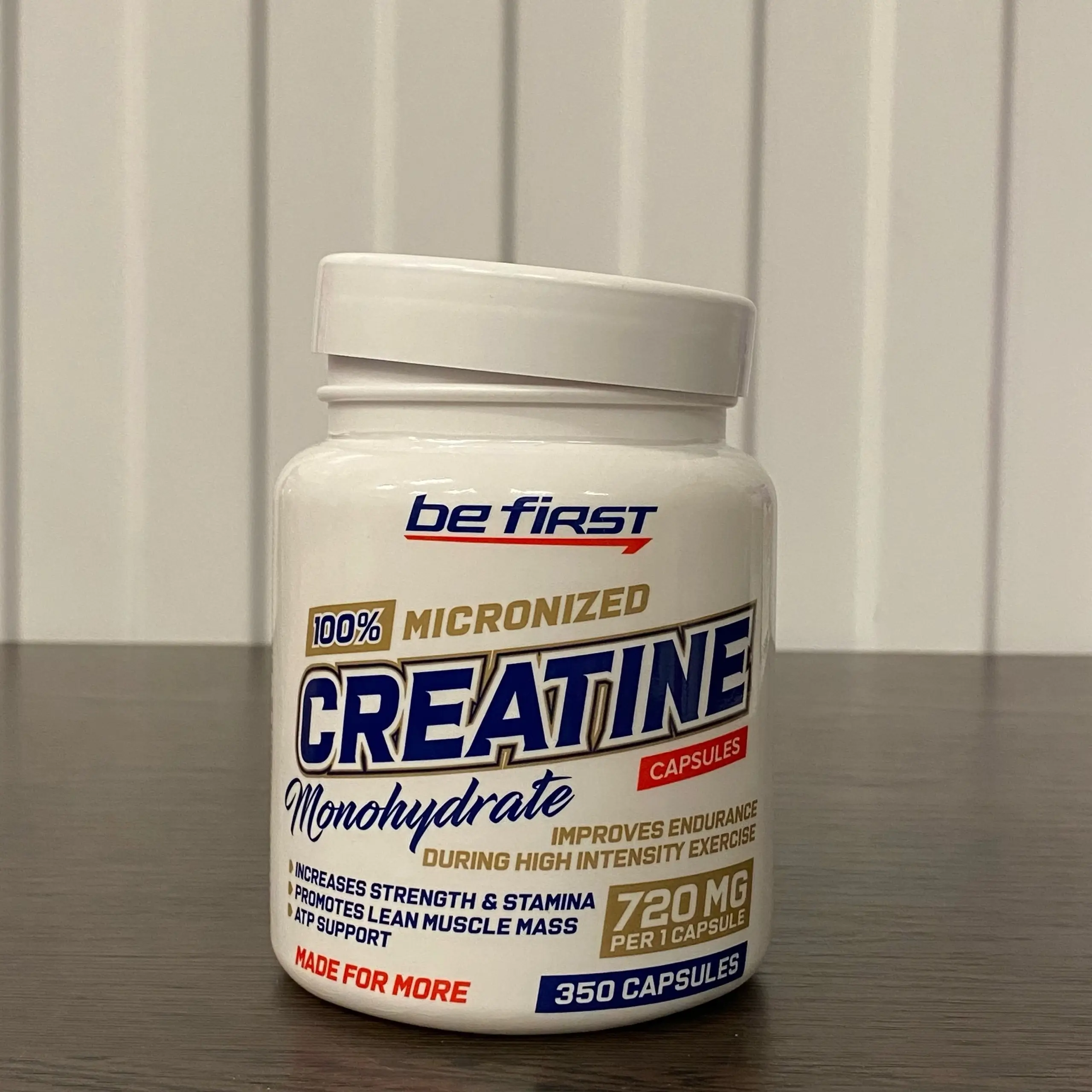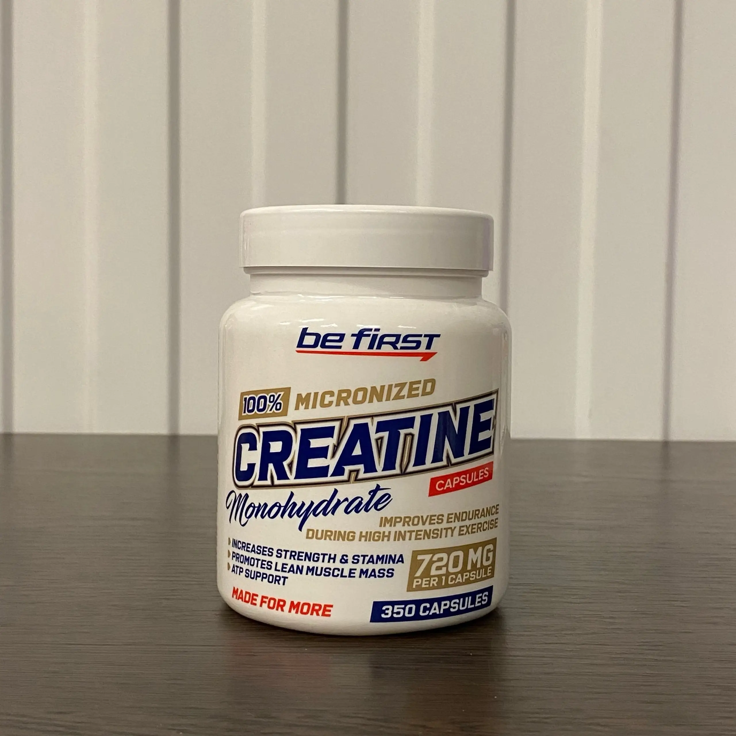 Be First Creatine Monohydrate Capsules дает дополнительную энергию мышечным волокнам, увеличивает силу, повышает работоспособность, ускоряет регенерацию мышечной системы и рост сухой массы.