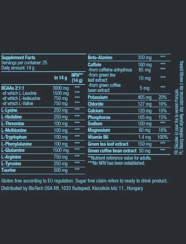 3900 мг EAA (9 незаменимых аминокислот) из них 3000 мг BCAA в пропорции 2:1:1