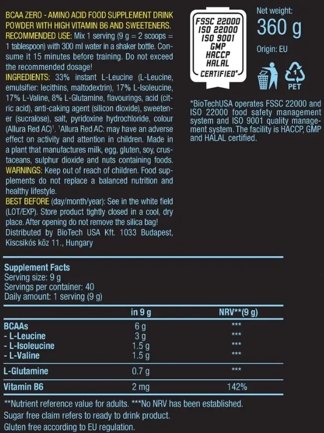 В одной порции (9 г): 3000 мг L-лейцина 1500 мг L-изолейцина 1500 мг L-валина 700 мг L-глютамина 2 мг витамина В6 Как и все продукты BioTech USA, BCAA Zero состоит из безопасных, тщательно отобранных ингредиентов.