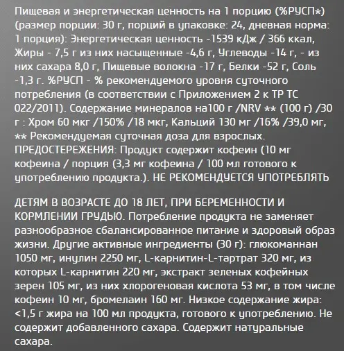 Богатая клетчаткой смесь с белком молочной сыворотки, глюкоманнаном, л-карнитином, хромом и подсластителем, с суперпфудами, без добавления сахара.