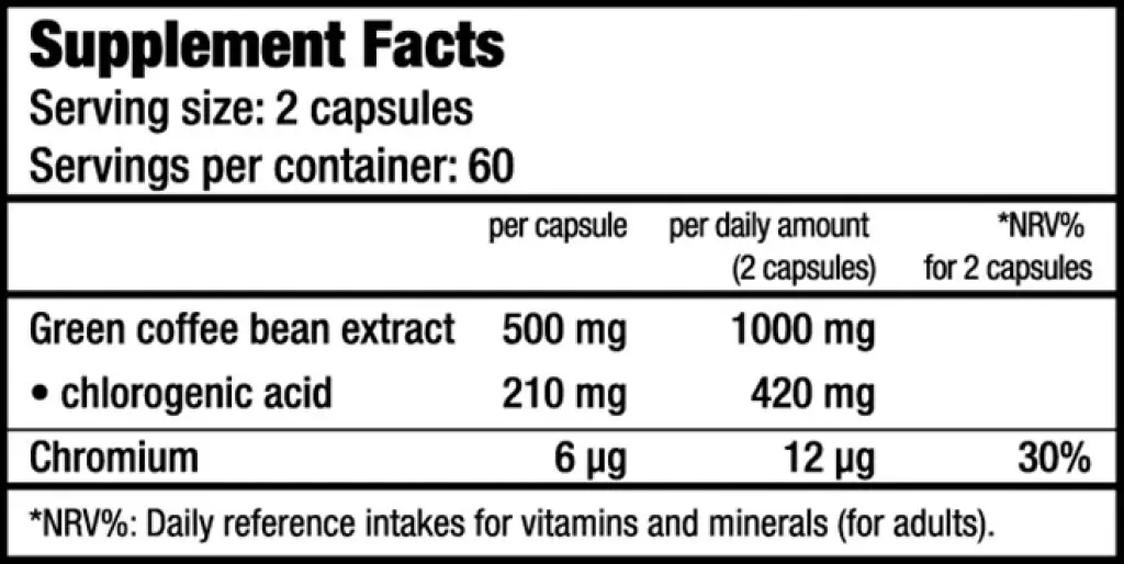 Ингредиенты: экстракт зеленого кофе в зернах (42% хлорогеновая кислота), наполнитель (мальтодекстрин), желатиновые капсулы (желатин, цвет: диоксид титана), пиколинат хрома.