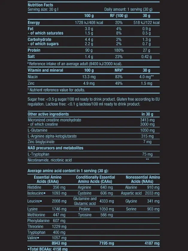 Содержит изолят сывороточного белка (Native Whey Isolate), 3000 мг креатина в одной порции, добавленный L-глутамин, AAKG и L-триптофан.