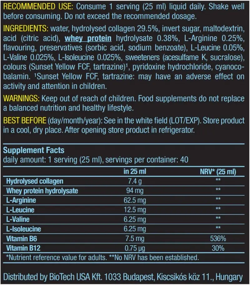Всего одна порция Liquid Amino снабжает организм 12 г чистых аминокислот из гидролизованного коллагена и гидролизата сывороточного белка. Как и все продукты BioTechUSA, Liquid Amino состоит из безопасных для здоровья и тщательно отобранных нутриентов. Формула данного усовершенствованного комплекса аминокислот состоит из ВСАА, соединённых пептидной связью и свободных аминокислот. Liquid Amino содержит все незаменимые, условно незаменимые и заменимые аминокислоты. Кроме того, ультрасовременный Liquid Amino содержит витамины B6 и B12, снижающие утомляемость. Витамин B6 способствует нормальному обмену белка и гликогена.