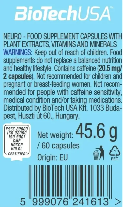 Капсулы BioTechUSA Neuro основаны на такой комбинации витаминов и минеральных веществ, которые способствуют нормальному функционированию нервной системы и поддержанию нормальных психологических и умственных функций. Под знаком комплексности мы также обогатили продукт растительными действующими веществами: экстрактами гинкго билоба, родиолы розовой и бакопы Монье.