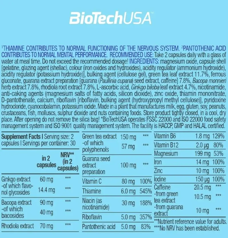 В суточной дозе (2 капсулы): Витамины и минеральные вещества: 80 мг витамина С; 6 мг тиамина (витамина В1); 30 мг ниацина ; 5 мг рибофлавина (витамина В2) ; 5 мг пантотеновой кислоты ; 1,8 мг витамина B6 ; 2 мкг витамина B12 ; 199 мг магния ; 14 мг железа ; 10 мг цинка ; 150 мкг йода ; Действующие вещества растительного происхождения : 60 мг экстракта гинкго билоба (в том числе флавонол-гликозидов: 14,4 мг) ; 90 мг экстракта бакопы монье (включая бакозиды: 40 мг) ; 70 мг экстракта родиолы розовой ; 150 мг экстракта зелёного чая (в том числе полифенолов: 57 мг, в том числе кофеин: 10,5 мг) ; 100 мг препарата из экстракта семян гуараны (в том числе кофеин: 10 мг) ; 20,5 мг кофеина (10,5 мг из экстракта зелёного чая и 10 мг из экстракта гуараны)