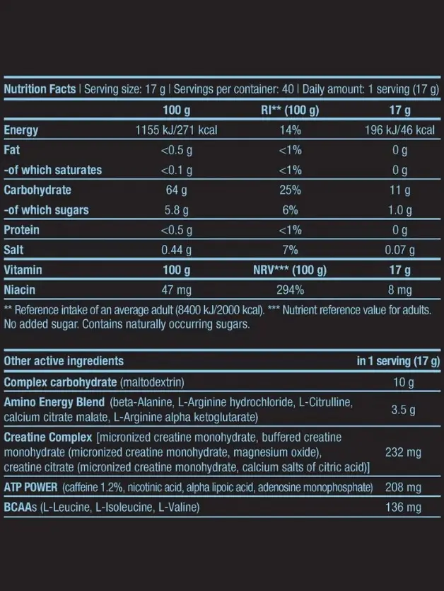 Способ применения: смешайте одну порцию (17 г = 1 мерная ложка без верха) с 250 мл воды. Выпейте одну порцию за 30 минут до тренировки.