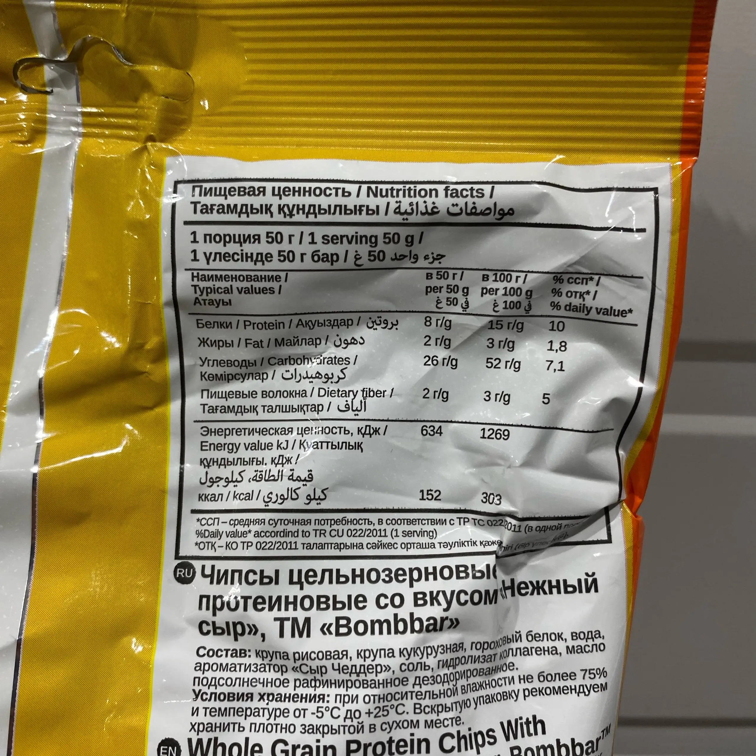 BOMBBAR Чипсы цельнозерновые протеиновые со вкусом 50g (Нежный Сыр) (раскрошены, 04/02/26)