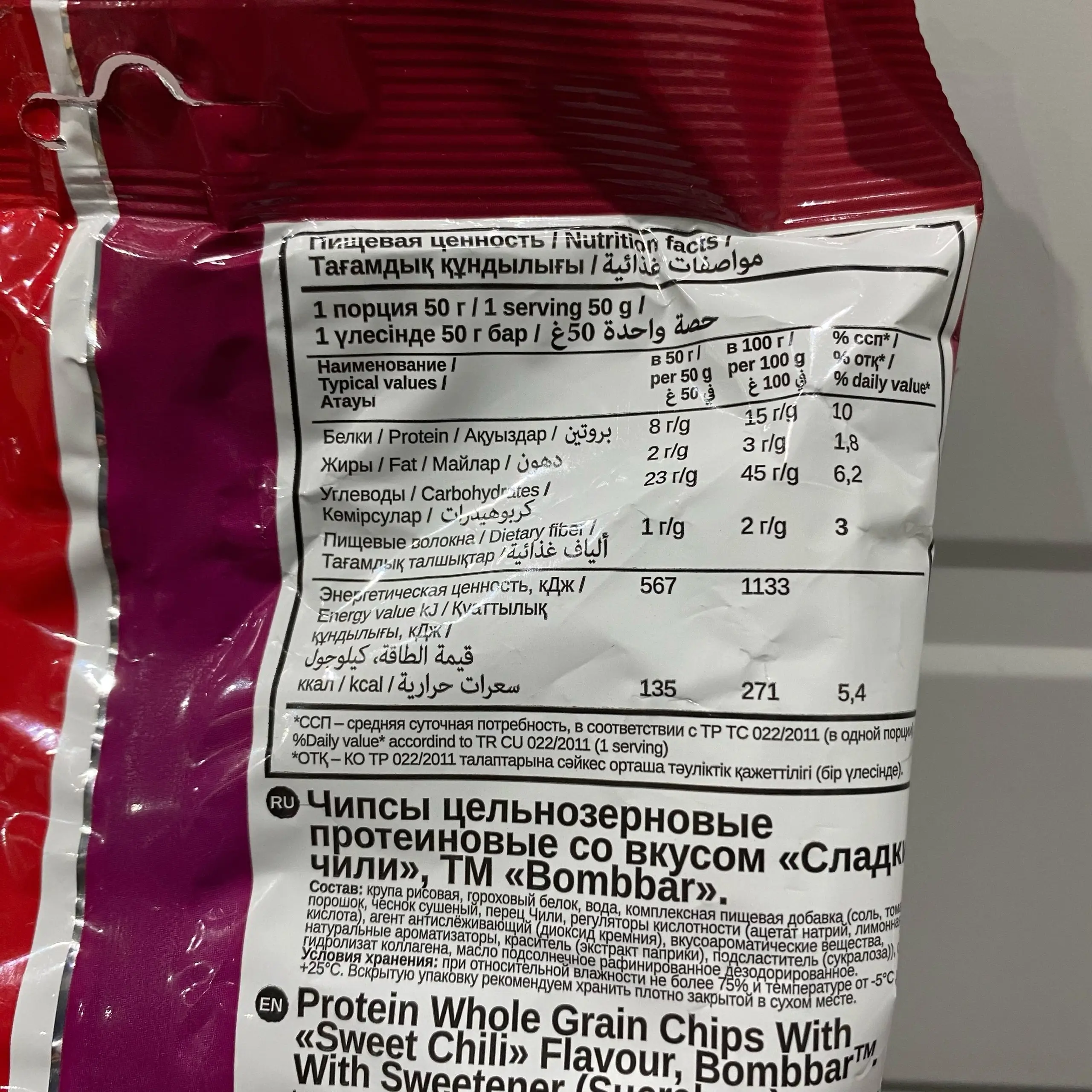 BOMBBAR Чипсы цельнозерновые протеиновые со вкусом 50g (Сладкий Чили) (раскрошены, 15/02/26)