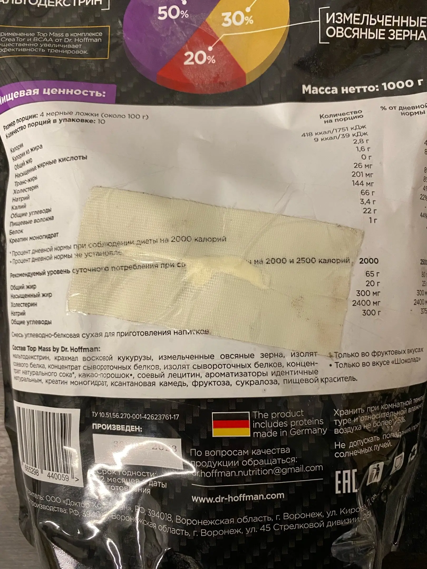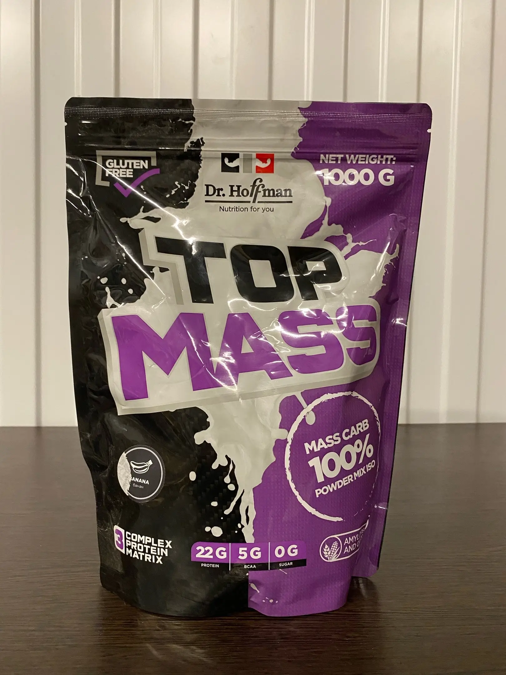 Top Mass Dr. Hoffman 1000 г-это российский гейнер с довольно высоким содержанием белка, 20г на 1 порцию и с хорошей углеводной матрицей включающей в себя несколько видов углеводов. Данный продукт рекомендуется принимать людям с высоким обменом веществ (быстрым метаболизмом) для увеличения калорийности суточного рациона.