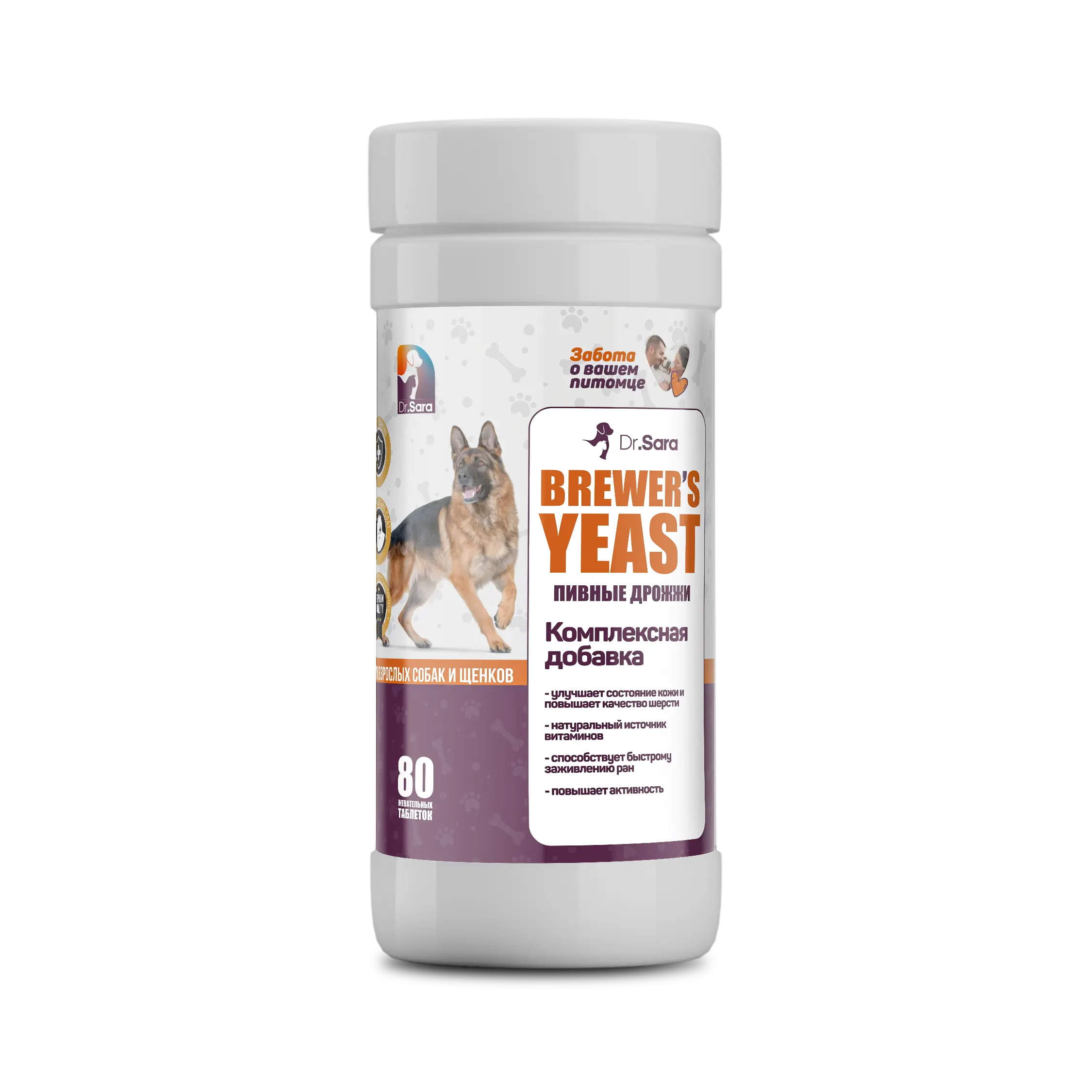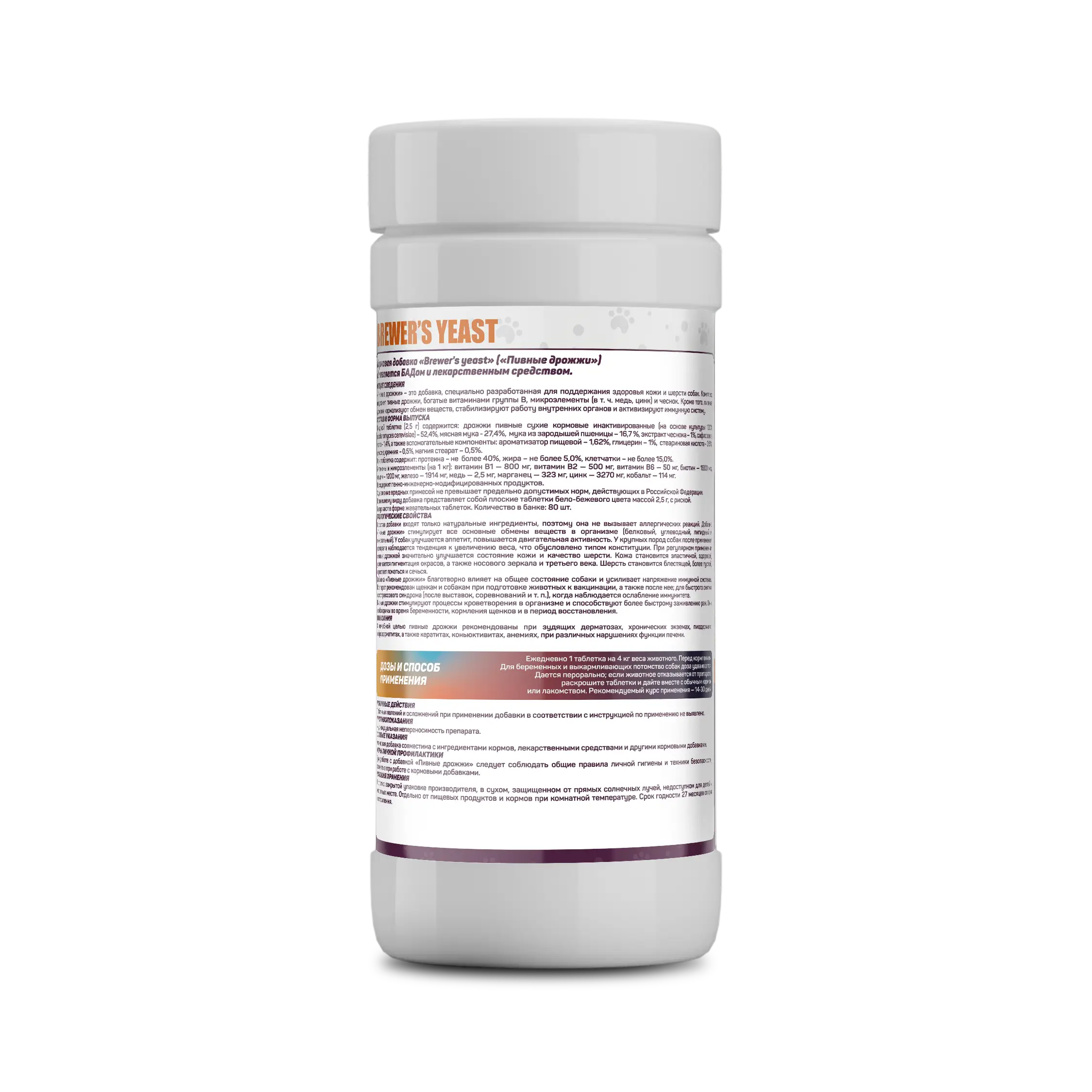 В состав добавки входят только натуральные ингредиенты, поэтому он не вызывает аллергических реакций. Добавка «Пивные дрожжи» стимулирует все основные обмены веществ в организме (белковый, углеводный, липидный и минеральный). У собак улучшается аппетит, повышается двигательная активность. У крупных пород собак после применения препарата наблюдается тенденция к увеличению веса, что обусловлено типом конституции. При регулярном применении пивных дрожжей значительно улучшается состояние кожи и качество шерсти. Кожа становится эластичная здоровая, усиливается пигментация окрасов, а также носового зеркала и третьего века. Шерсть становится блестящей, более густой, перестает ломаться и сечься.