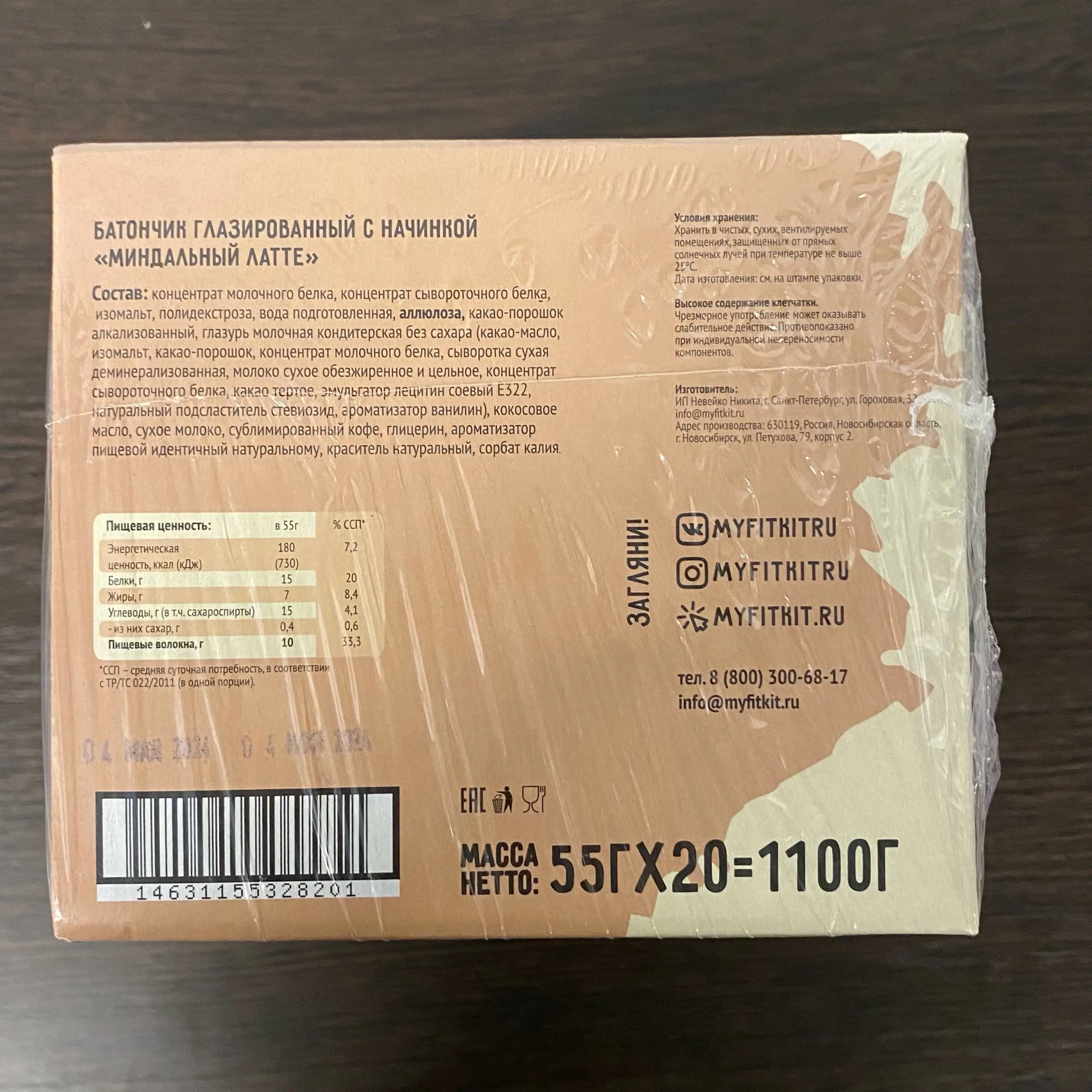 В 60 г одной порции протеинового батончика в среднем содержится 15 г белка, 14 г клетчатки и 5 г жиров. Произведено всё в лучших традициях FIT KIT – из импортного сырья, без добавления сахара.
