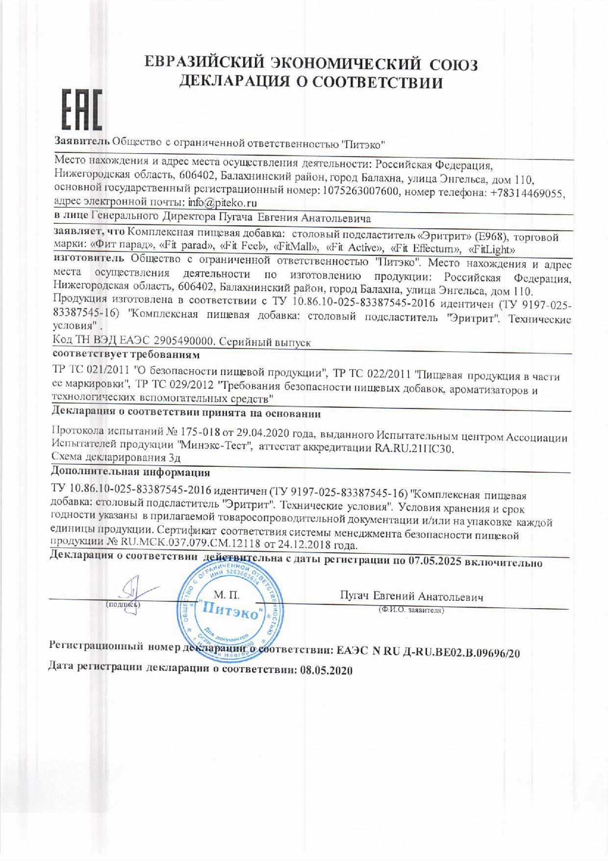 Состав продукта: полиол – эритрит, непитательные интенсивные подсластители – сукралоза, стевиозид. Не содержит ГМО.
