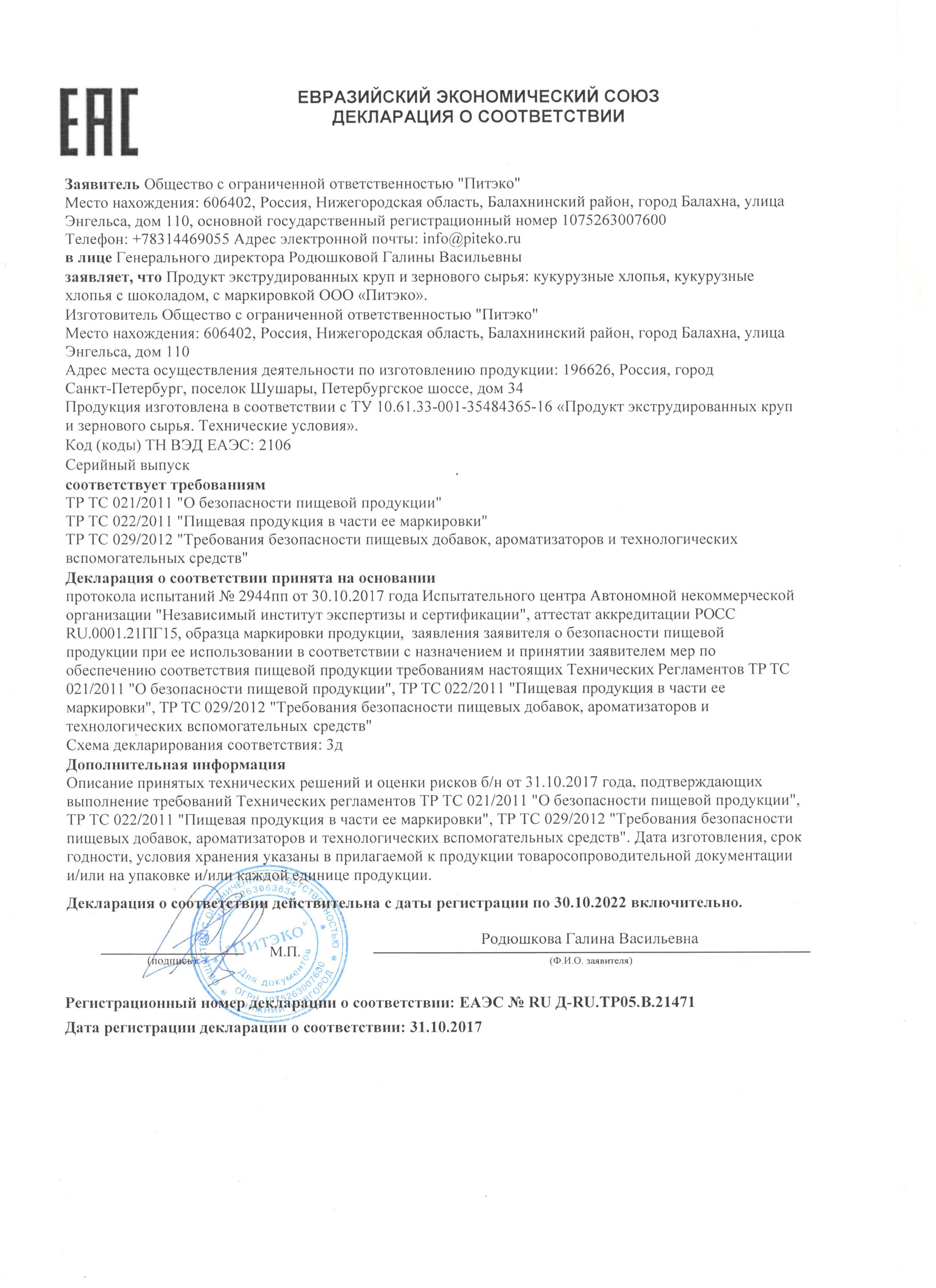 Состав: крупа кукурузная, инулин, соль йодированная, премикс витаминный, подсластитель - сукралоза (Е955), подсластитель - стевиозид (Е960).