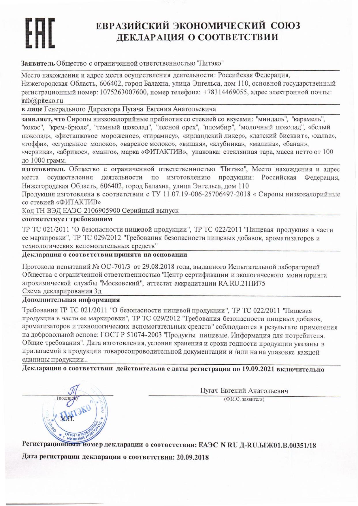 Состав: сироп инулина (из цикория), вода, молоко сухое обезжиренное массовой жира не более 1,5%, какао-порошок обезжиренный (жирность не более 1%), ароматизатор "Шоколад", лимонный кислота (Е330), комплексная пищевая добавка "Тиксогам S" (смола акации, загуститель ксантановая камедь), подсластитель стевиозид (Е960), консервант - сорбат калия (Е202).