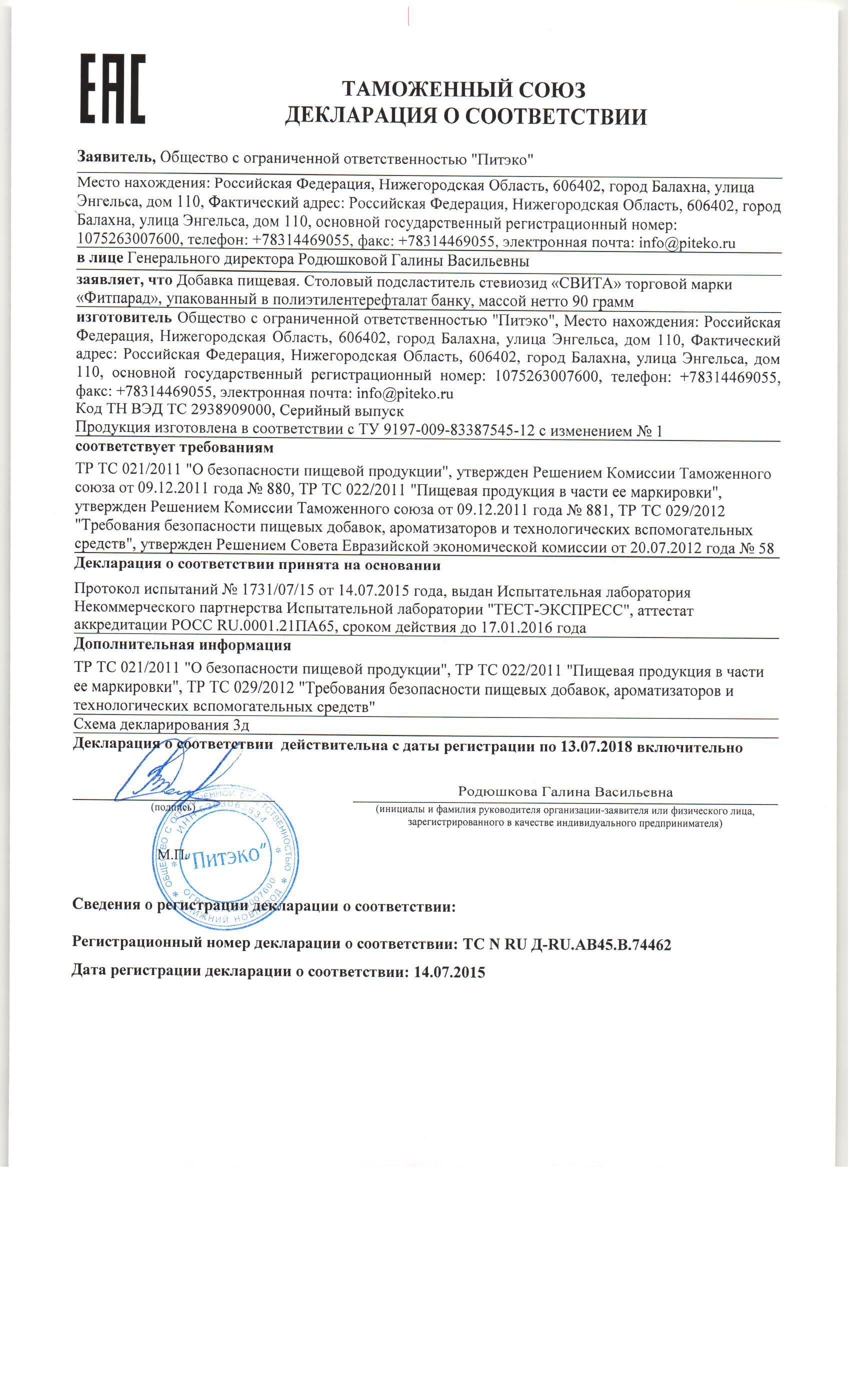 Состав продукта: добавка пищевая – стевиозид «СВИТА» – 100%.Не содержит ГМО.