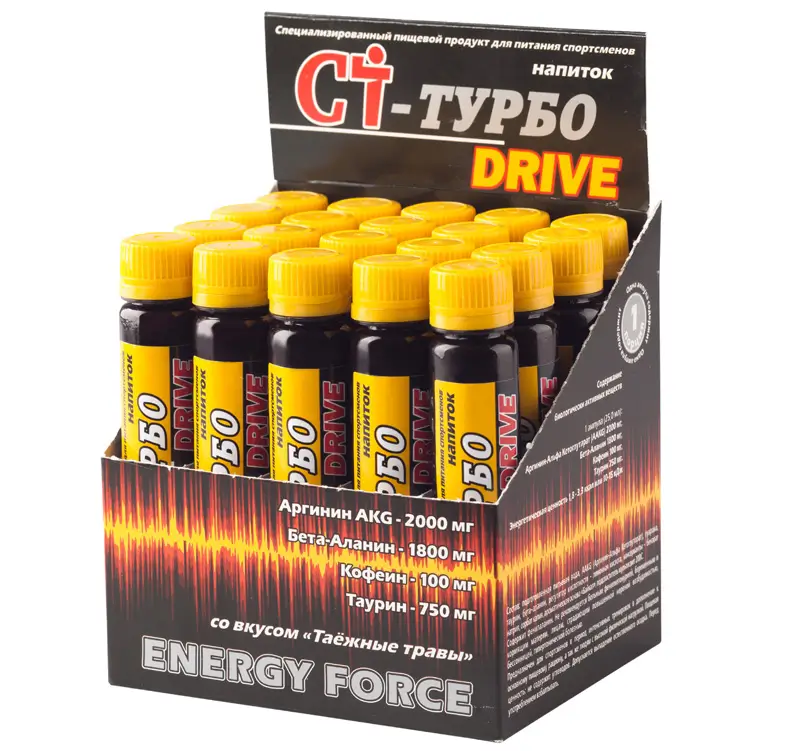 Также в СТ-Турбо DRIVE содержится аминокислота бета-аланин, которая снижает выработку молочной кислоты и выводит её из мышц, предохраняя их от деградации. Напиток помогает бороться с усталостью и мышечной болью после тренировок, повышает работоспособность и выносливость, способствует восстановлению после травм.