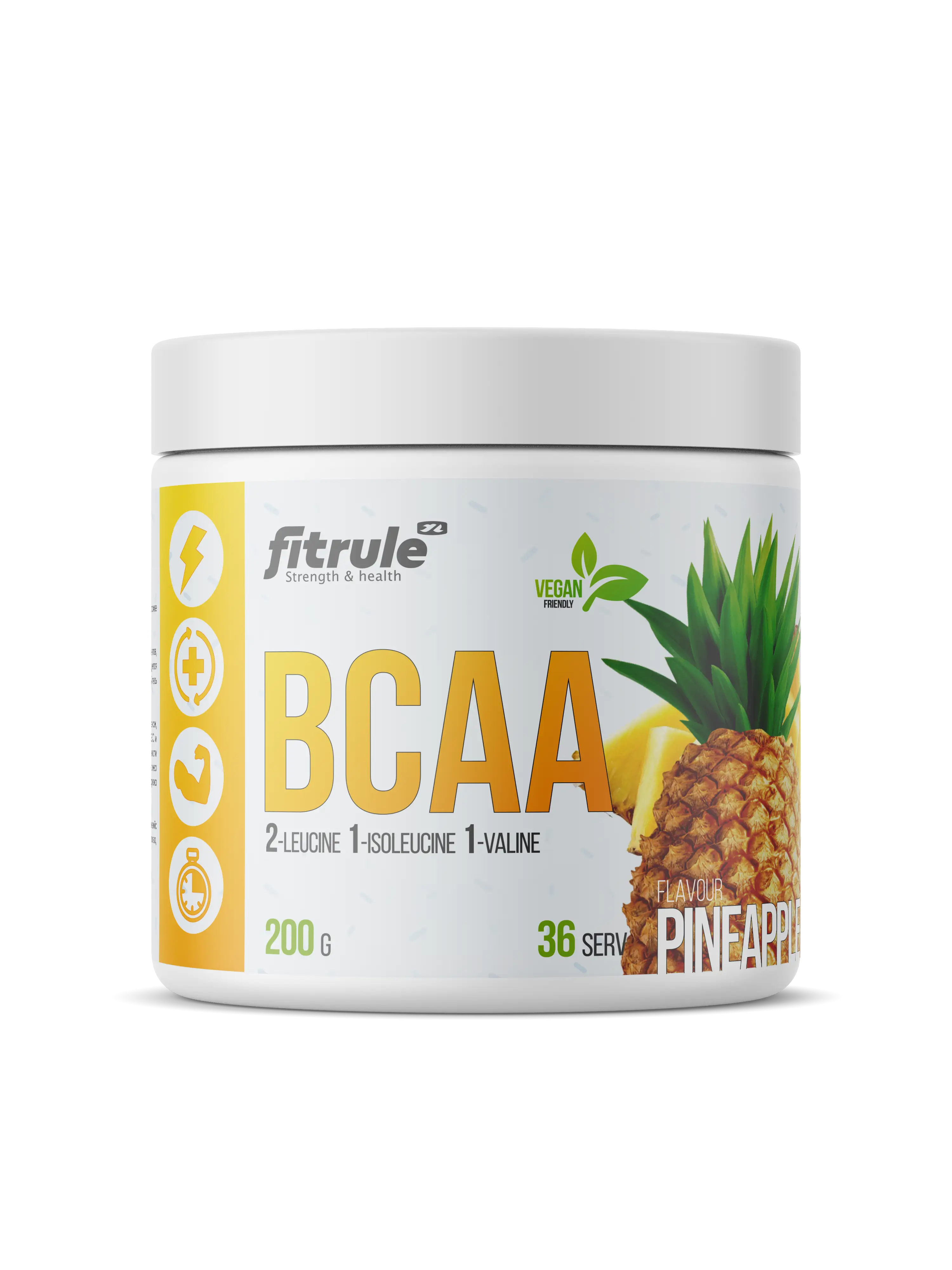 Fitrule BCAA Powder – это аминокислотный комплекс, включающий три наиболее важных для мышц аминокислоты – лейцин, изолейцин и валин. Эти аминокислоты выполняют три главных для организма функции: восстановление мышиной ткани, защита мышц от катаболизма и поддержание уровня энергии во время нагрузки.