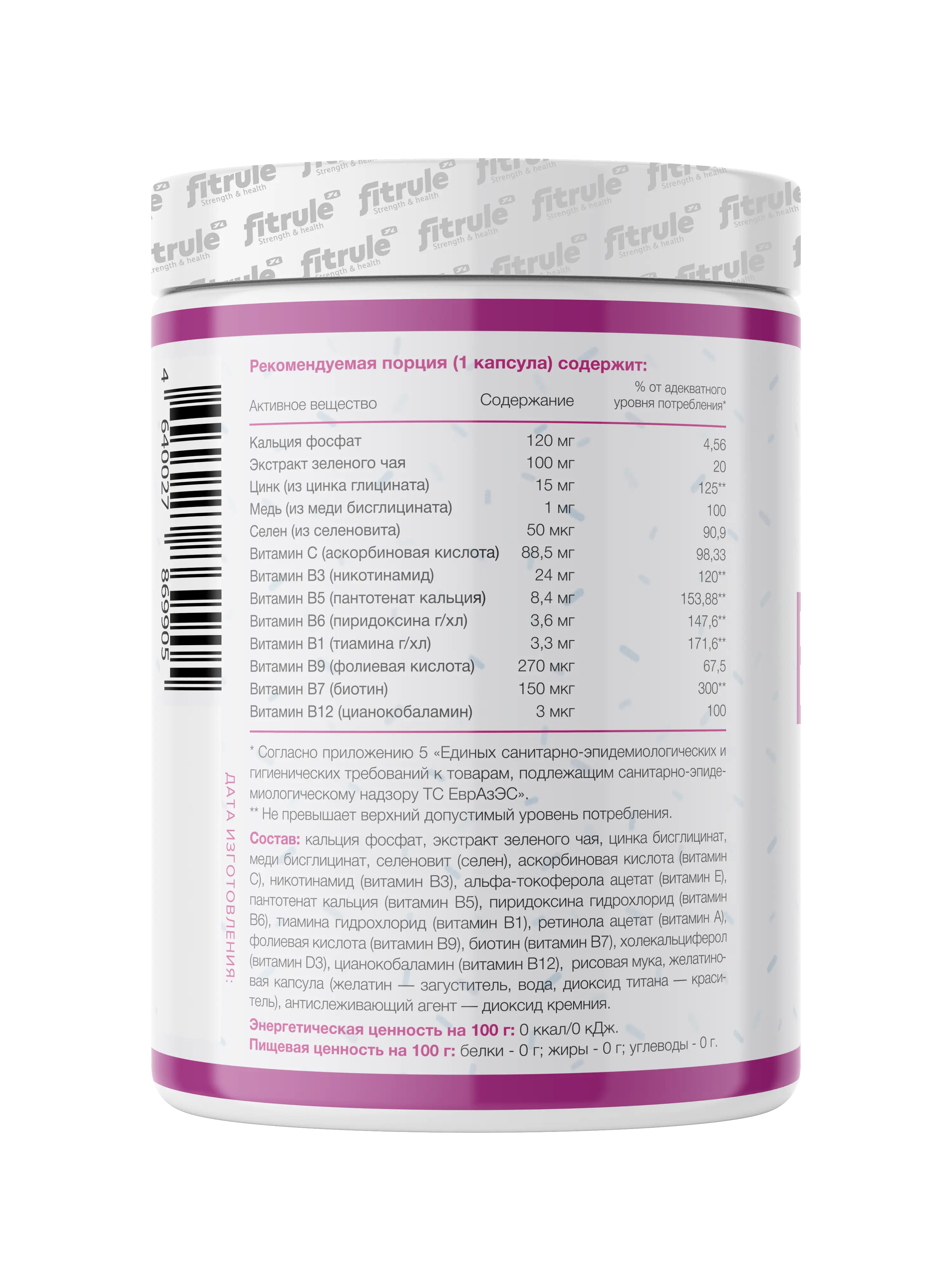 Состав: кальция фосфат, экстракт зеленого чая, цинка бисглицинат, меди бисглицинат, селеновит (селен), аскорбиновая кислота (витамин), никотинамид (витамин ВЗ), альфа-токоферола ацетат (витамин Е) пантотенат кальция (витамин. Вб), пиридоксина гидрохлорид (витамин В6), тиамина гидрохлорид (витамин В1), ретинола ацетат (витамин А) фолиевая кислота (витамин В9), биотин (витамин В7), холекальциферол(витамин В3), цианокобаламин (витамин В12), рисовая мука, желатиновая капсула (желатин — загуститель, вода, диоксид титана — красиантислеживающий агент — диоксид кремния.