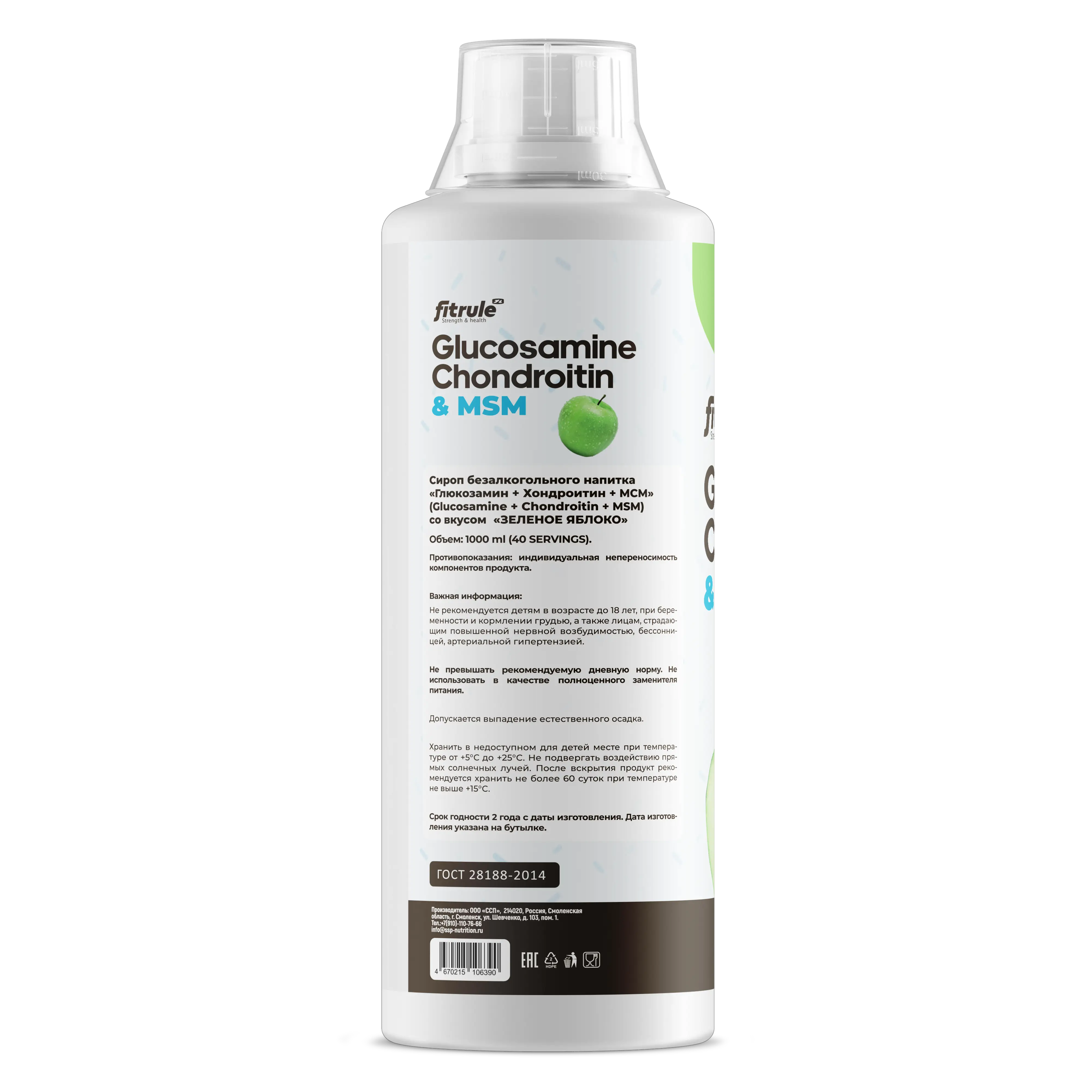 Состав: подготовленная питьевая вода, глюкозамина сульфат, хондроитина сульфат, метилсульфонилметон (МСМ), загуститель — карбоксиметилцеллюлоза (Е466), подсластители — сукролоза (Е955), калия оцесульфам (Е95О), регулятор кислотности — лимонная кислота (ЕЗЗО), ароматизаторы пищевые, консерванты - калия сорбат (Е2О2), натрия бензоат (Е211).