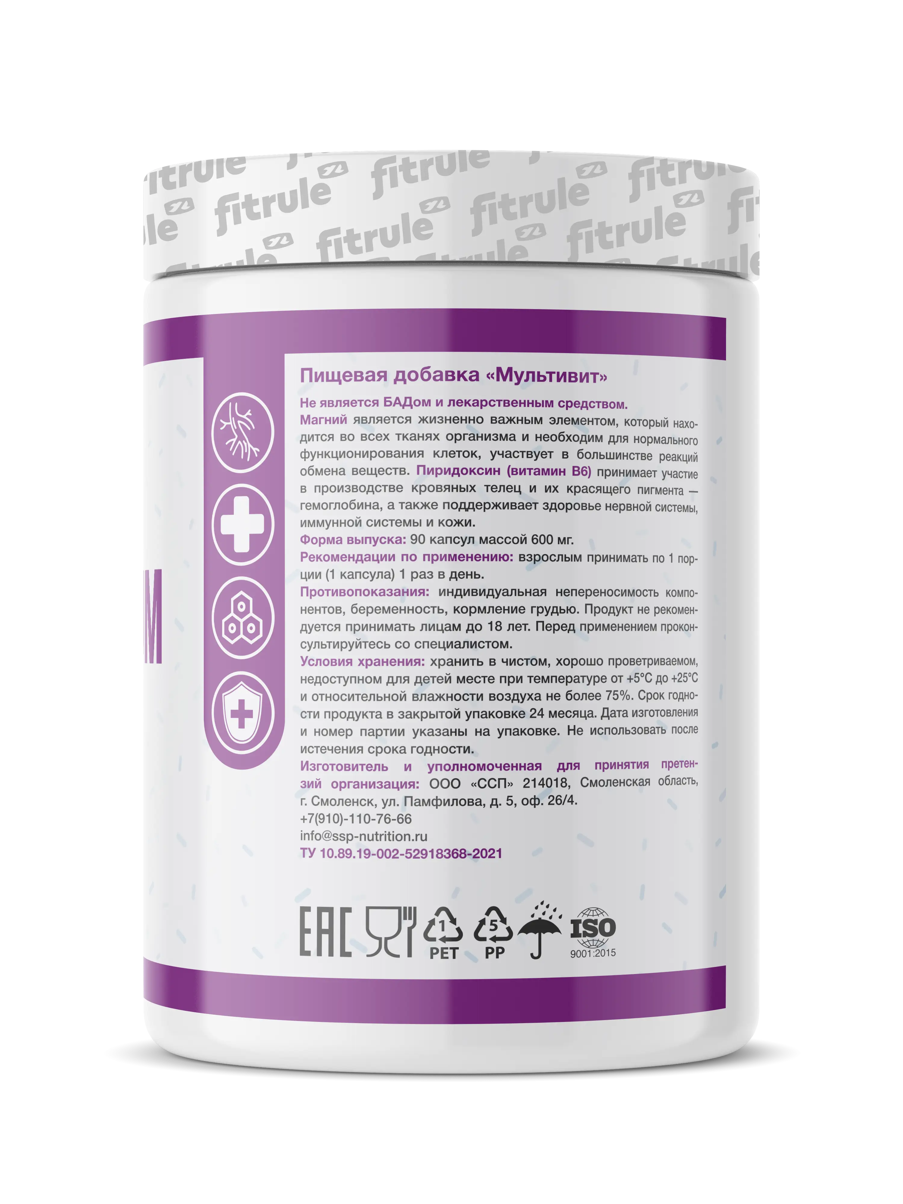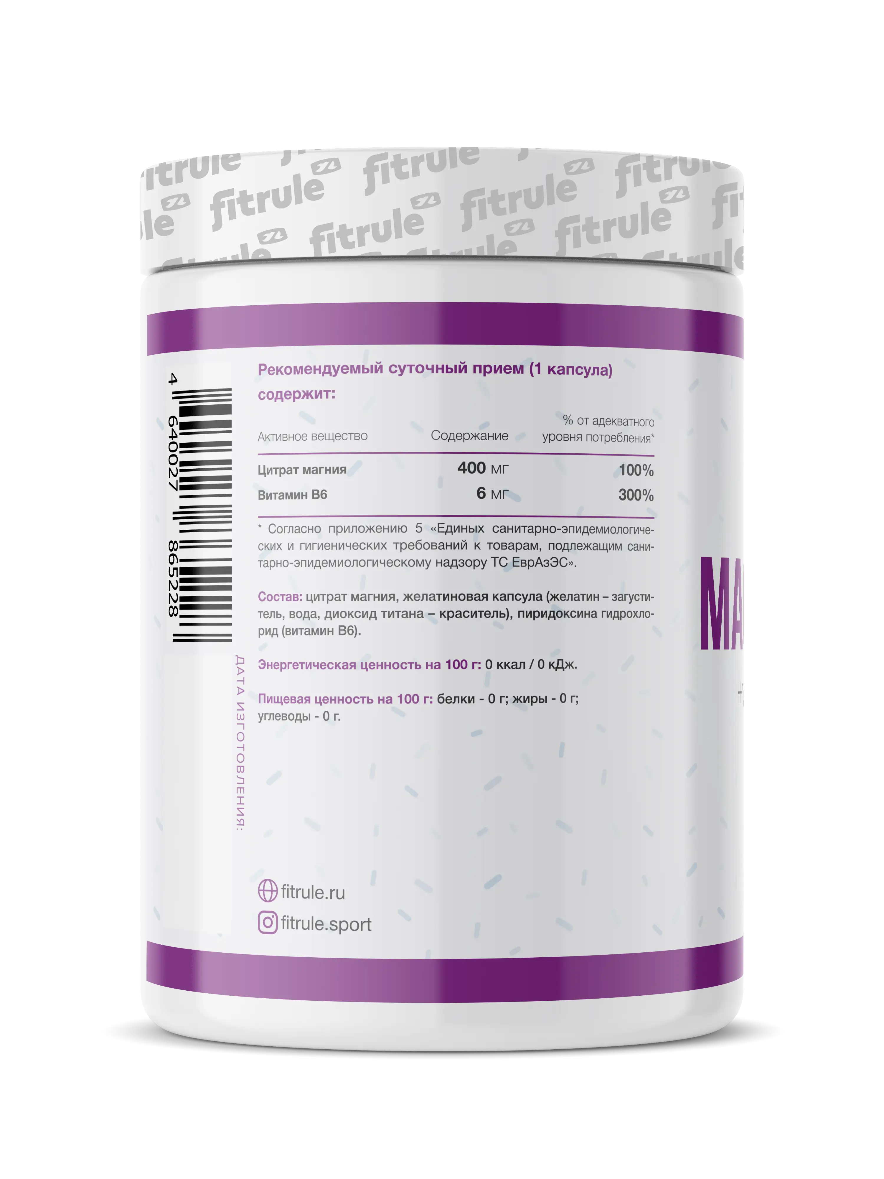Fitrule Magnesium + В6 – это специальная форма магния в соединении с лимонной кислотой. Наличие цитрата (лимонной кислоты) обеспечивает более высокую биодоступность магния, а также повышает эффективность образования энергии внутри клетки (цикл образования АТФ)