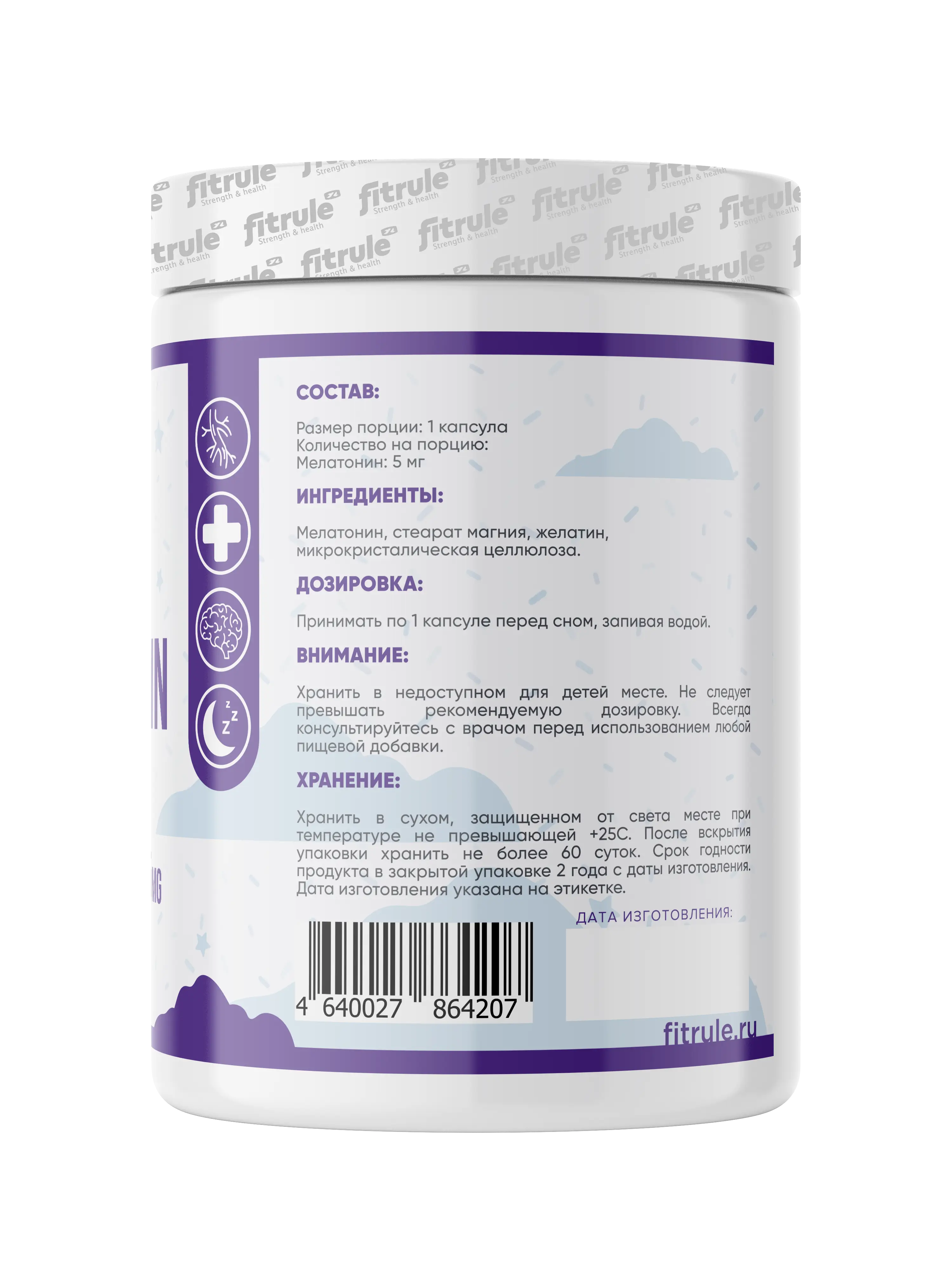 Fitrule Melatonin – это главный гормон сна, который регулирует суточные (циркадные) биоритмы. Обеспечивает засыпание и поддержание фаз сна. При занятиях спортом прием мелатонина крайне важен для восстановления ЦНС, которая подвергается большим нагрузкам и переутомлению.