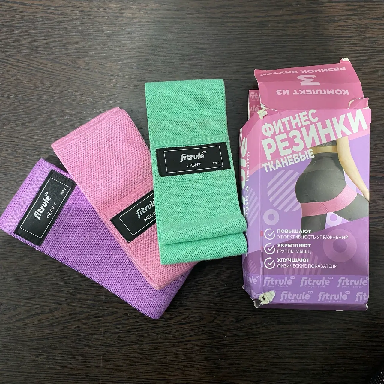 FITRULE Набор тканевых фитнес-резинок 3 шт. (зеленый 27 kg, розовый 41kg, фиолетовый 68 kg) (испорчена упаковка)