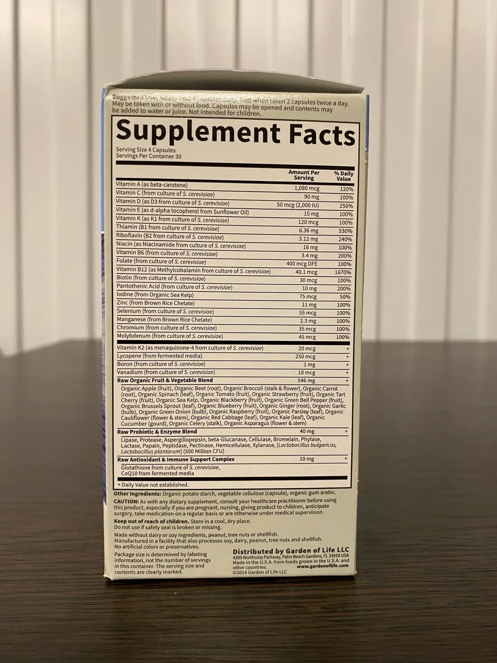 | Смесь органических необработанных фруктов и овощей Органическое яблоко (плод), органическая свекла (корнеплод), органическая брокколи (стебель и цветок), органическая морковь (корнеплод), органический шпинат (лист), органический томат (плод), органическая клубника (плод), органическая вишня (плод), органические морские бурые водоросли, органическая ежевика (плод), органический зеленый болгарский перец (плод), органическая брюссельская капуста (лист), органическая голубика (плод), органический имбирь (корень), органический чеснок (луковица), органический зеленый лук (луковица), органическая малина (плод), органическая петрушка (лист), органическая цветная капуста (цветок и стебель), органическая краснокочанная капуста (лист), органическая листовая капуста (лист), органический огурец (плод), органический сельдерей (стебель), органическая спаржа (цветок и стебель) |