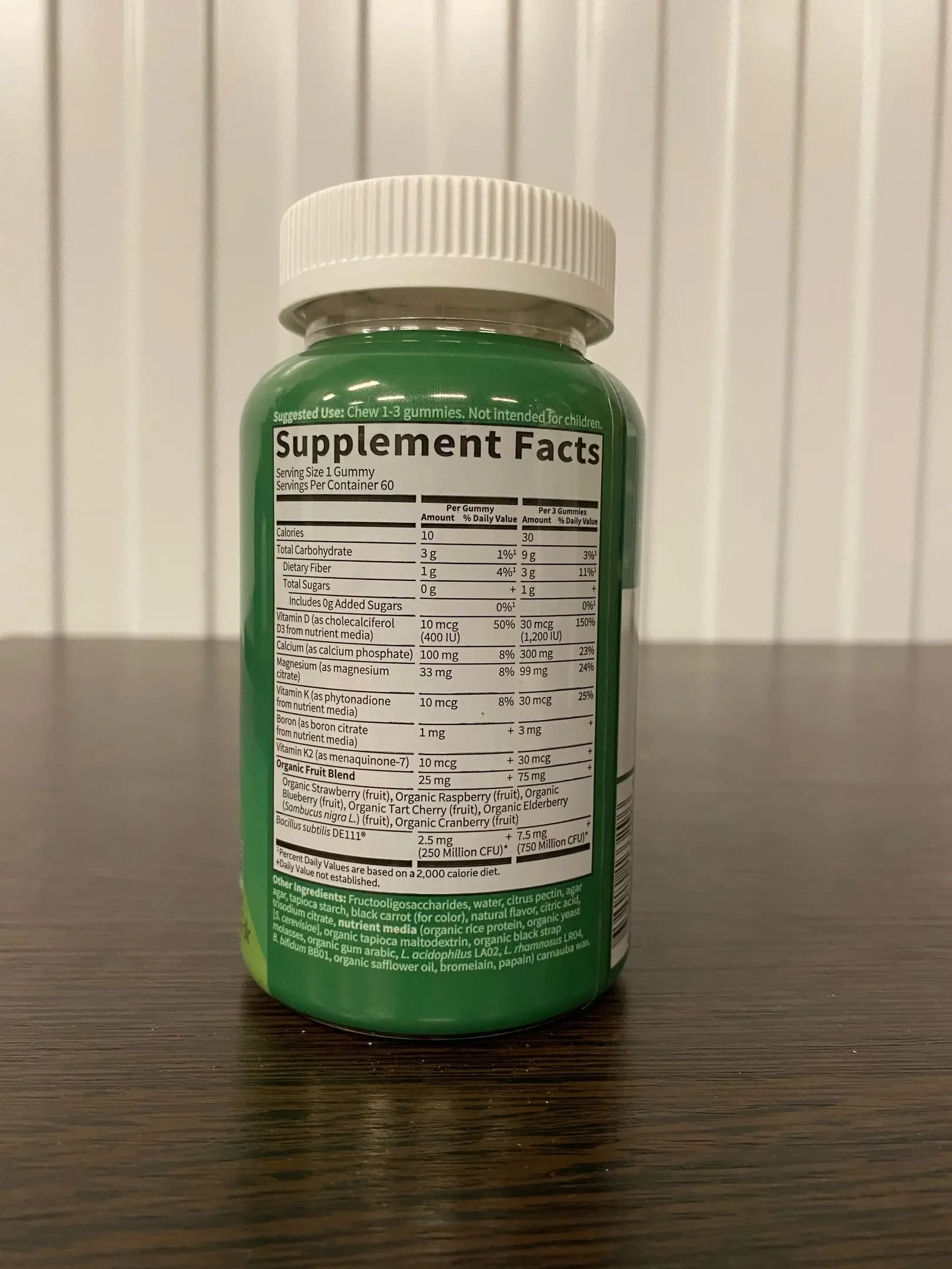 Не секрет, что с возрастом здоровье и сила наших костей становятся все более важными. Теперь у вас есть кальций-магниевые жевательные мармеладки, в которых есть все самое интересное, и они просто восхитительны! Созданные с заботой о здоровье костей, витаминные жевательные таблетки с кальцием и магнием содержат 100 мг кальция, ферментированные витамины D3 и K2, а также клинически изученные пробиотики Bacillus subtilis DE111® в одной вкусной жевательной мармеладке. Эти вкусные жевательные мармеладки увеличивают прочность костей, снижают риск развития остеопороза и поддерживают здоровье пищеварительной системы. И все это с добавлением 0 г сахара! Эти аппетитные жевательные мармеладки со вкусом малины не содержат ГМО и сертифицированы NSF, что делает их полезным питанием для здоровья ваших костей.
