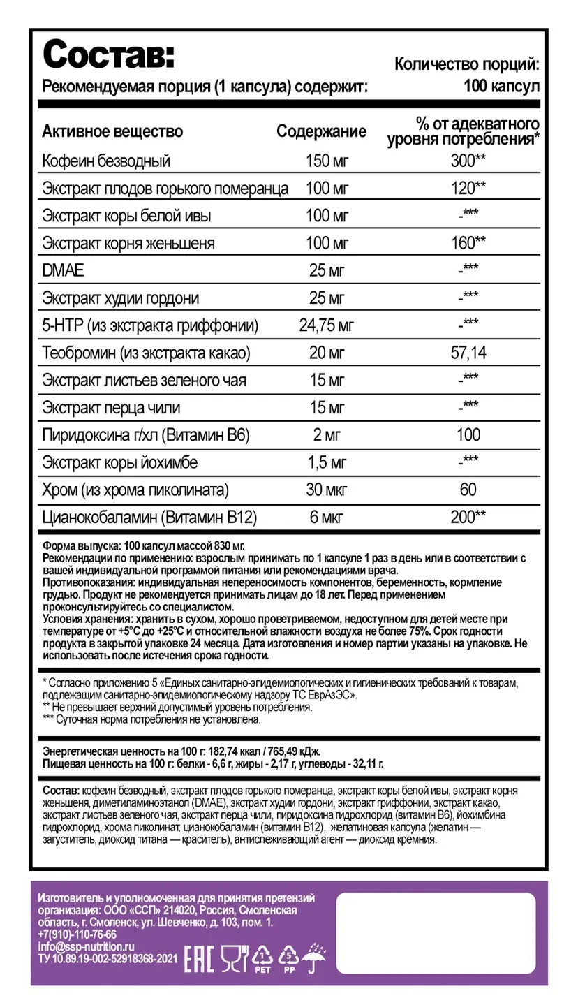 Состав: кофеин безводный; Экстракт плодов горького померанца; экстракт коры белой ивы; Экстракт корня женьшеня; DMAE; экстракт худии гордони; 5-HTР (из экстракта гриффонии); Теобромин (из экстракта какао); экстракт листьев зеленого чая; экстракт перца чили; пиридоксина г/хл (витамин В6); экстракт коры йохимбе; Хром (из хрома пиколината); цианокобаламин (витамин В12)