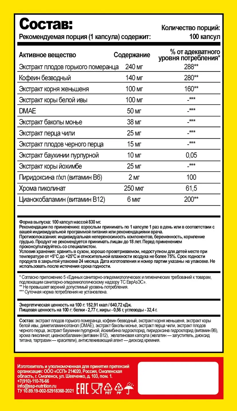 Состав на одну порцию: Экстракт плодов горького померанца – 240 мг Кофеин безводный – 140 мг Экстракт корня женьшеня – 100 мг Экстракт коры белой ивы – 100 мг DMAE – 50 мг Экстракт бакопы монье – 38 мг Экстракт перца чили – 25 мг Экстракт плодов черного перца – 15 мг Экстракт баухинии пурпурной – 10 мг Экстракт коры йохимбе – 25 мг Пиридоксина гидрохлорид (витамин В6) – 2 мг Хрома пиколинат – 250 мкг Цианокобаламин (витамин В12) – 6 мкг
