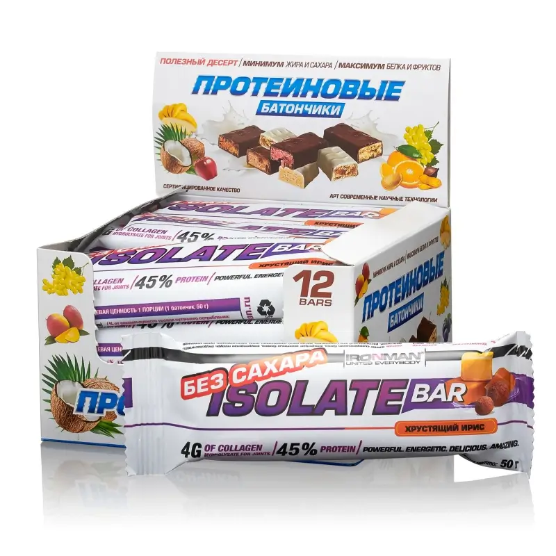 Батончик IRONMAN Isolate Bar («Изолят Бар») со вкусом «хрустящий ирис» - первый высокопротеиновый батончик, по - настоящему, не содержащий «простых» сахаров.