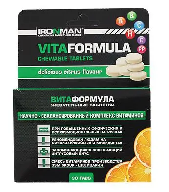 Вита Формула IRONMAN - это витамины на каждый день, выпущенные в новой для компании IRONMAN форме - жевательных таблеток со вкусом апельсина или лимона. Витамины можно купить в упаковках: 30 и 90 жевательных таблеток.