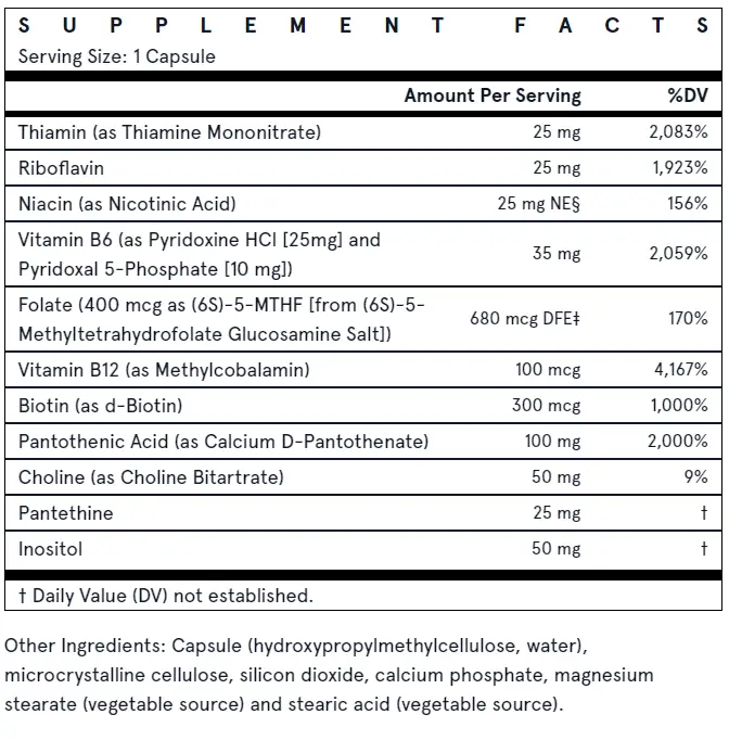 Jarrow Formulas B-Right — это оптимизированный комплекс B, содержащий формы витаминов B1 (тиамин), B 2 (рибофлавин), B5 (пантетин), B 6 (P-5-P), B 12 (метилкобаламин) и B9 (метилфолат), которые эффективно усваиваются организмом.* Витамины группы B играют важную роль в организме, включая выработку клеточной энергии, поддержание иммунитета и управление стрессом.*