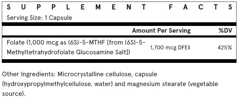 Метилфолат ((6S)-5-метилтетрагидрофолат или (6S)-5-MTHF) представляет собой высоко биологически активную форму фолата.* Из-за ограниченной способности организма превращать синтетическую фолиевую кислоту в активную форму фолата прием добавок с 5 -MTHF весьма предпочтителен.