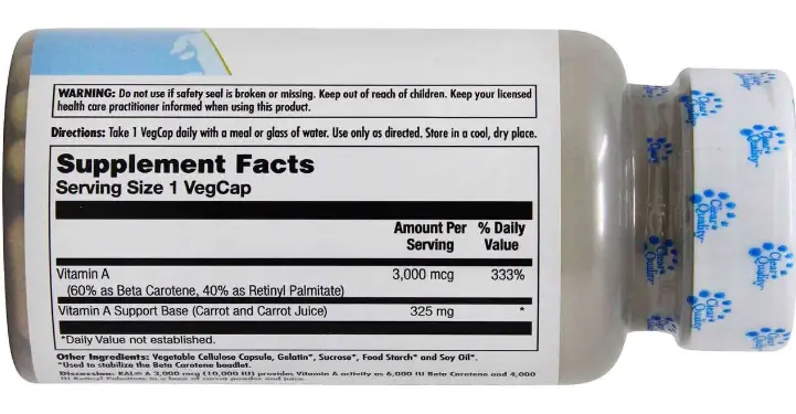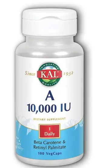 Kal Витамин А обеспечивает 10 000 МЕ общей активности витамина А в виде 6 000 МЕ бета-каротина и 4 000 МЕ ретинилпальмитата на основе морковного порошка и сока. Акация используется, чтобы помочь эмульгировать или диспергировать натуральное масло, характерное для витамина А.