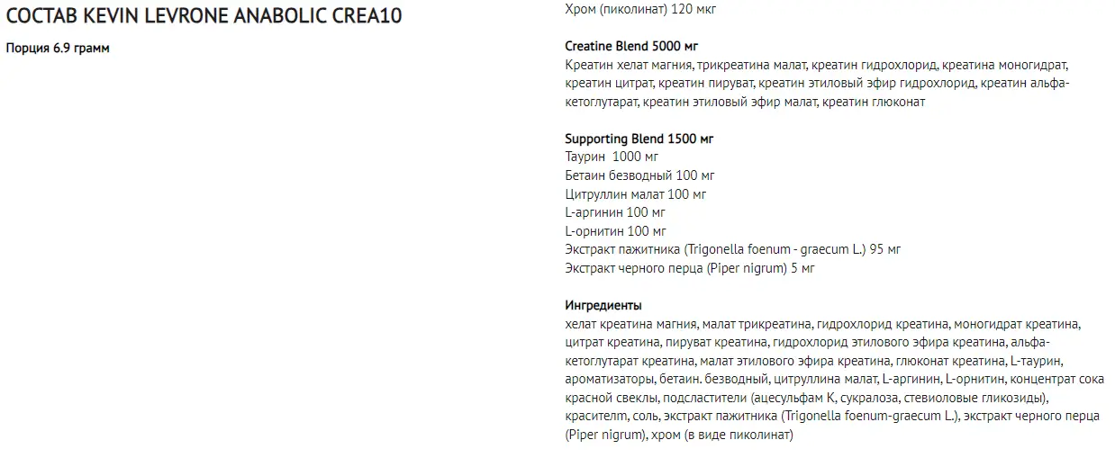 Kevin Levrone Anabolic Crea10 – это уникальный продукт, в составе которого имеется 10 форм креатина. Он обогащен ингредиентами, ускоряющими набор мышечной массы и повышающими силовые показатели. Этот креатин отлично подходит для набора мышечной массы, а высокая концентрация лучших форм креатина увеличивает силовую выносливость. Благоприятный эффект достигается при ежедневном приеме 5 г креатина. Levro Anabolic CREA 10 – это то, что выбирают добросовестные бодибилдеры и тяжеловесы, чтобы повысить физическую производительность и добиться своей цели!