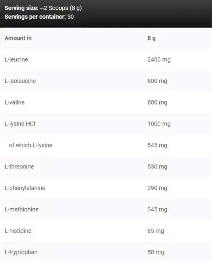 Состав: Комплекс аминокислот (L-лейцин, L-изолейцин, L-валин, L-лизин HCl, L-треонин, L-фенилаланин, L-метионин, L-гистидин, L-триптофан), ароматизаторы , регуляторы кислотности ( Е330, Е296), ароматизаторы, концентрат сока красной свеклы, антислеживатель (Е551), концентрат сока красной свеклы , подсластители ( ацесульфам К, сукралоза, стевиоловые гликозиды из стевии), краситель [(E160a), (E110) ].E110.