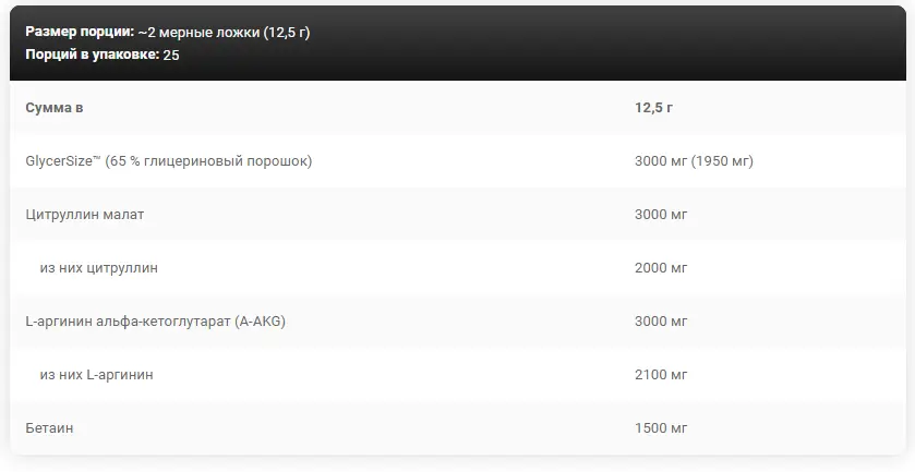 Анаболический комплекс. Пищевая добавка. С подсластителями. Предтренировочная формула, содержащая запатентованную форму глицерина - GlycerSize™, цитруллин, L-аргинин и бетаин, предназначена для физически активных взрослых и спортсменов.