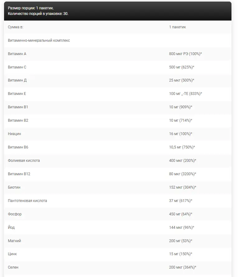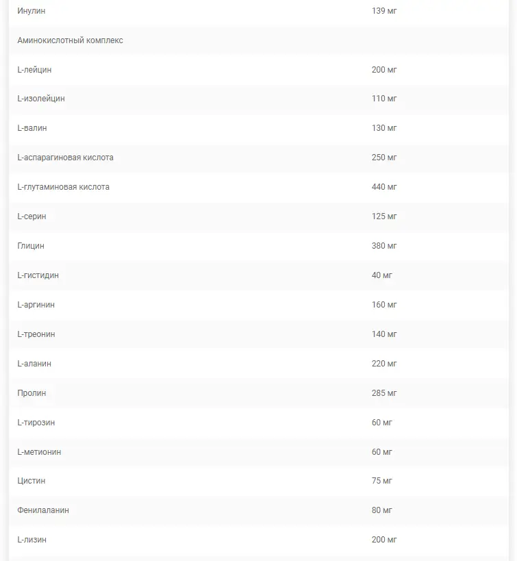 Состав: Белковый комплекс [гидролизованный говяжий белок, концентрат сывороточного белка (из молока), гидролизованный концентрат сывороточного белка (из молока), гидролизованный казеин (из молока), изолят сывороточного белка (из молока)], витаминно-минеральный комплекс [карбонат кальция, соли кальция] ортофосфорная кислота, витамин С (L-аскорбиновая кислота), оксид магния, витамин Е (сукцинат D-альфа-токофериловой кислоты), пантотеновая кислота (D-пантотенат кальция), селенит натрия, оксид цинка, ниацин (никотинамид), витамин B6. (пиридоксина гидрохлорид), витамин D (холекальциферол), витамин B1 (мононитрат тиамина), витамин B2 (рибофлавин), витамин B12 (цианокобаламин), витамин A (ретинилацетат), сульфат марганца, сульфат меди, фолиевая кислота (птероилмоноглутаминовая кислота), йодид калия, биотин (D-биотин), хлорид хрома (III), наполнитель (E460(i)), мальтодекстрин,противослеживающие агенты (E341, E470b, E551, E553b), укрепляющие агенты (E466, E463), таурин, экстракт корня женьшеня Panax (5% гинзенозидов, Panax ginseng CA Mey), цитрусовые биофлавоноиды (Citrus aurantium L.), плоды боярышника экстракт (3% биофлавоноидов, Crataegus curvisepala Lindm.), экстракт виноградных косточек (Vitis vinifera L.), экстракт сосновой коры (Pinus Pinaster Ait.), парааминобензойная кислота, L-карнитин, коэнзим Q10, ликопин, лютеин, битартрат холина. , инулин, инозитол, глазирующий агент (Е1521), краситель (Е172).L-карнитин, коэнзим Q10, ликопин, лютеин, битартрат холина, инулин, инозитол, глазирующий агент (Е1521), краситель (Е172).L-карнитин, коэнзим Q10, ликопин, лютеин, битартрат холина, инулин, инозитол, глазирующий агент (Е1521), краситель (Е172).
