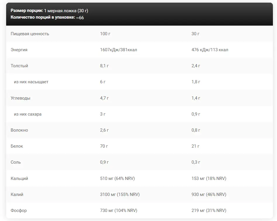 Ингредиенты: OPTIPEP® 80 [гидролизованный сывороточный белок (из молока)], концентрат сывороточного белка 80% (из молока), какао, загуститель (ксантановая камедь), антислеживатель (диоксид кремния), ароматизатор, подсластитель (сукралоза), соль. .