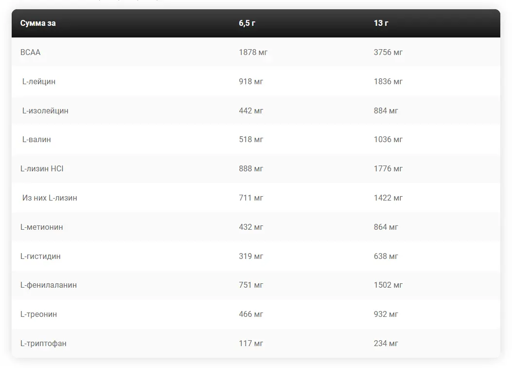 Ингредиенты: Аминоматрица (L-лейцин, L-лизин HCl, L-фенилаланин, L-валин, L-треонин, L-изолейцин, L-метионин, L-гистидин, L-триптофан), инулин (из цикория), кислота. (лимонная кислота), подсластитель (сукралоза), ароматизаторы.