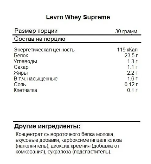 Протеин Levro Whey Supreme сочетает в себе отборное сырье, передовые методы обработки и сбалансированную формулу. С каждой его порции вы получаете 23 грамма биодоступного сывороточного белка, который хорошо усваивается и обладает широким аминокислотным профилем. Никакого сахара, аспартама или сои в составе. Вы получаете максимально качественный, натуральный протеин, который дополняет несколько насыщенных вкусов.
