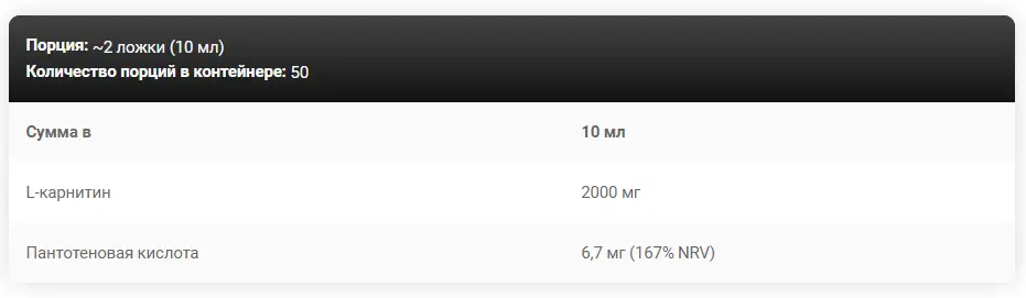 Состав: вода, L-карнитин, пантотеновая кислота (D-пантотенат, кальций), кислоты (Е330, Е296), ароматизаторы, подсластители (ацесульфам К, сукралоза, неотам, стевиолгликозиды из стевии), консерванты (сорбат калия, бензоат натрия). , краситель (E150d), мальтодекстрин.